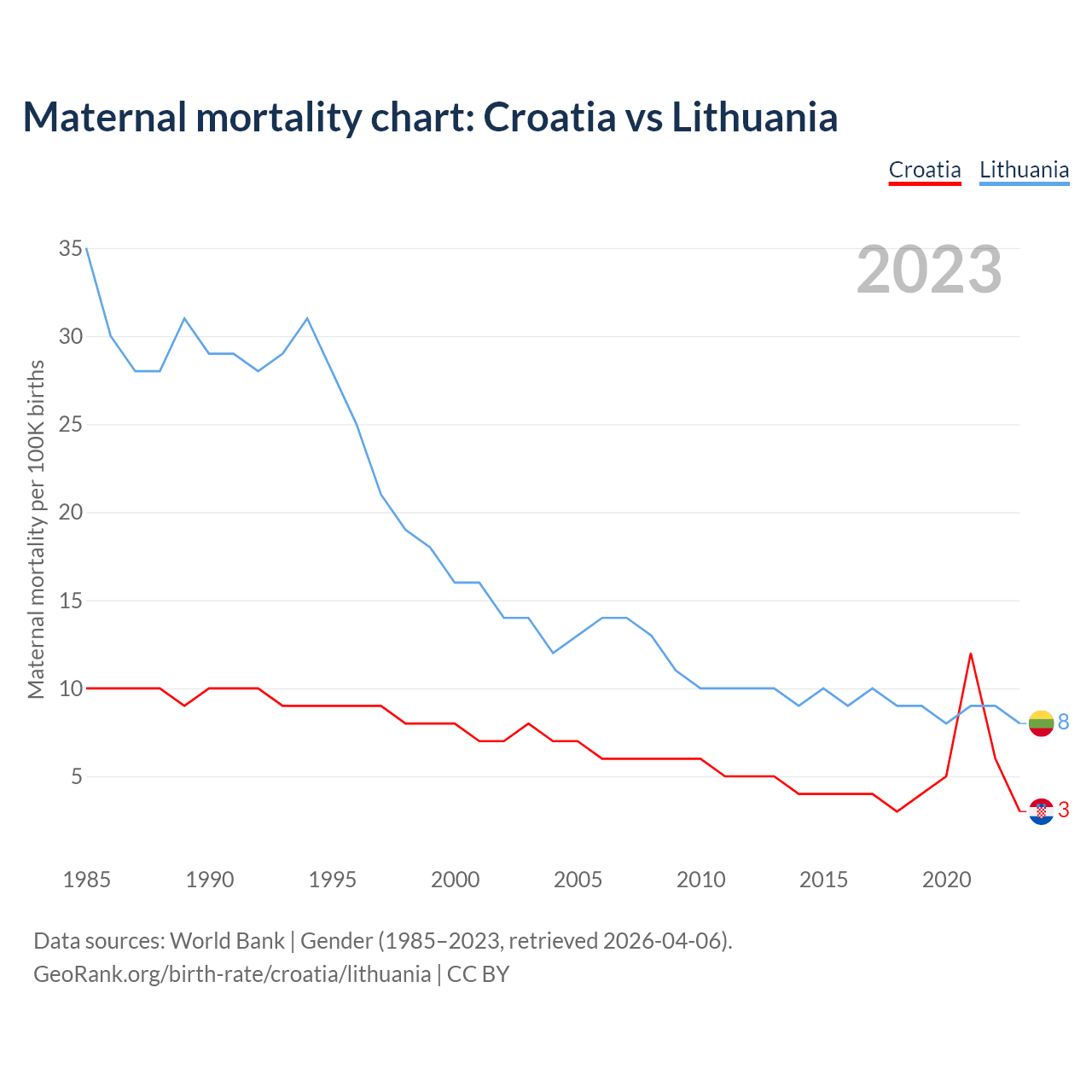 The maternal mortality rate, which is the probability of dying during childbirth or within 42 days of pregnancy termination, is 3 deaths per 100,000 live births in Croatia, compared to 8 deaths in Lithuania.