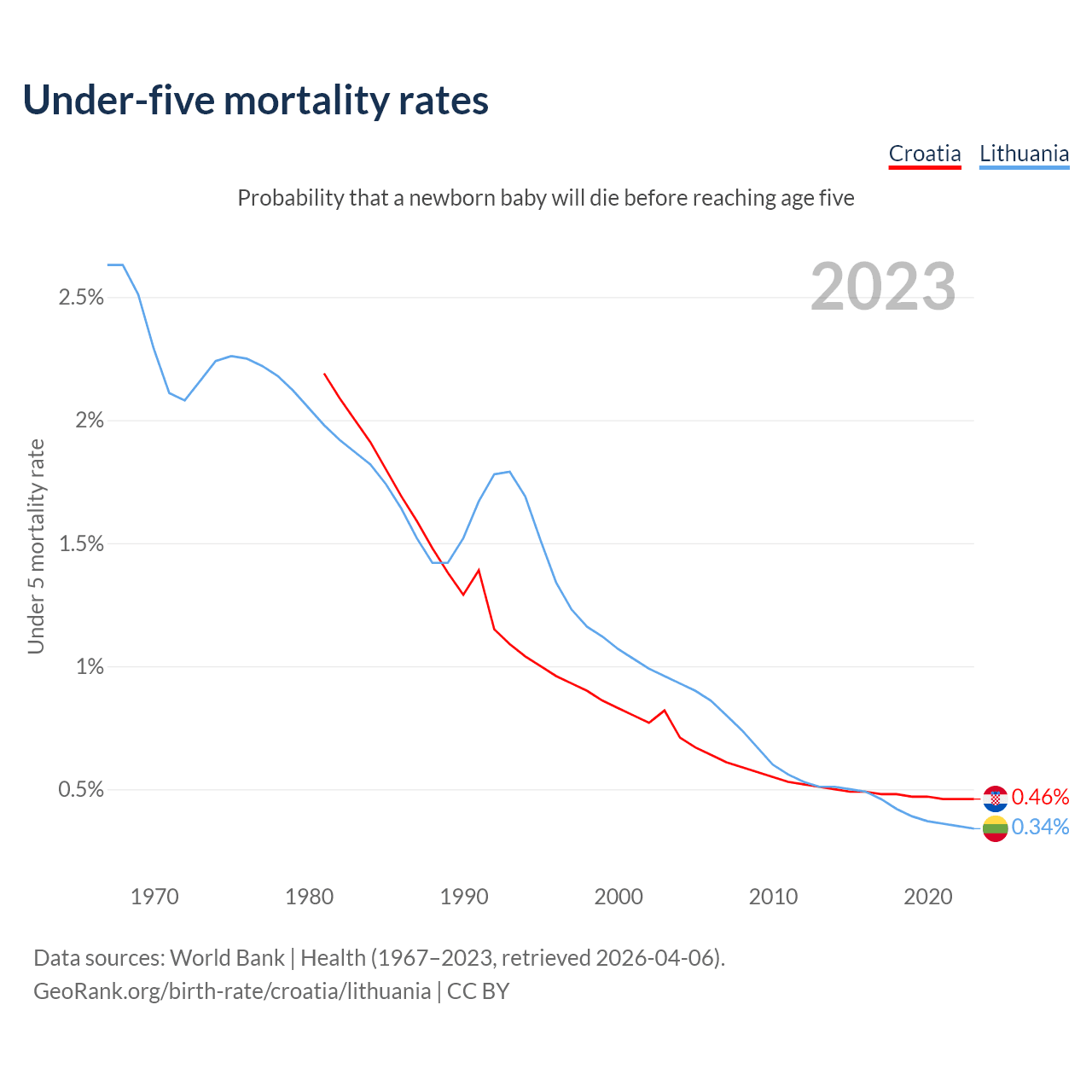 The chance that a newborn baby will die before reaching age five is 0.46% in Croatia and 0.34% in Lithuania. Above is a chart with historical data on under-five mortality rates.