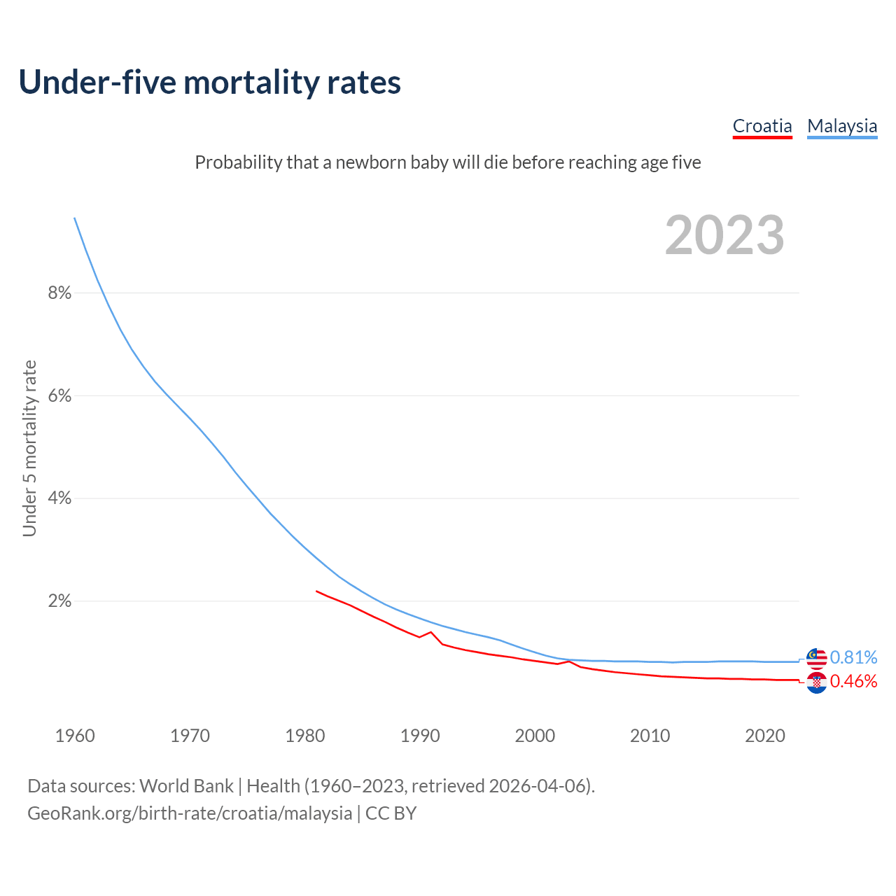 The chance that a newborn baby will die before reaching age five is 0.46% in Croatia and 0.81% in Malaysia. Above is a chart with historical data on under-five mortality rates.