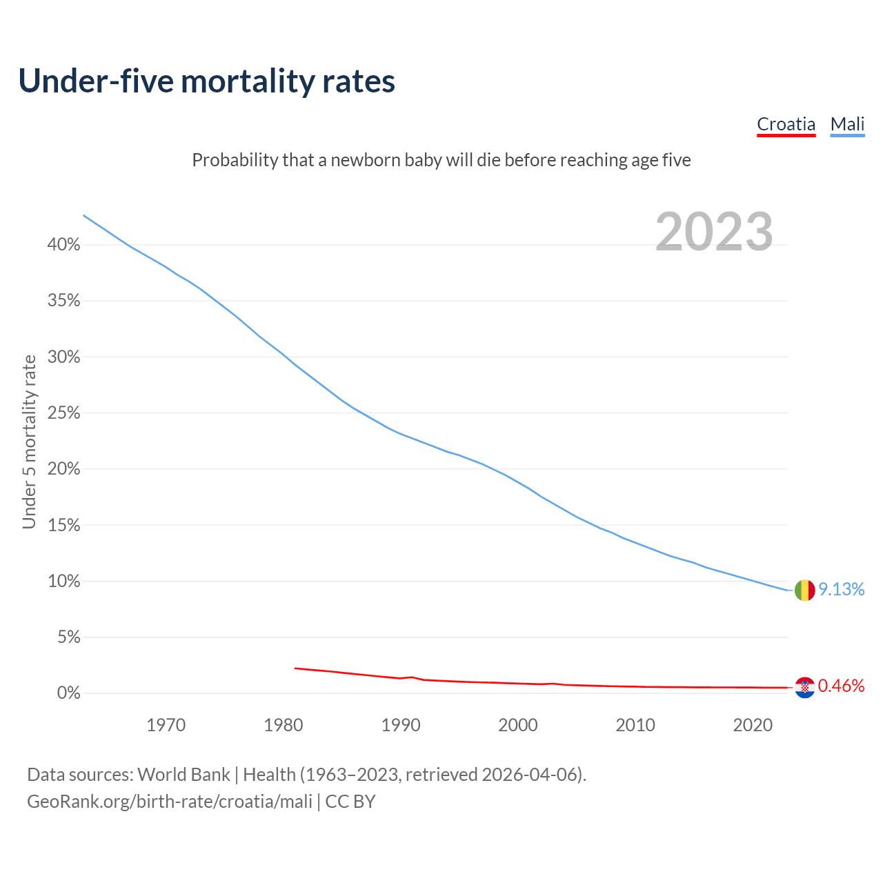 The chance that a newborn baby will die before reaching age five is 0.46% in Croatia and 9.13% in Mali. Above is a chart with historical data on under-five mortality rates.