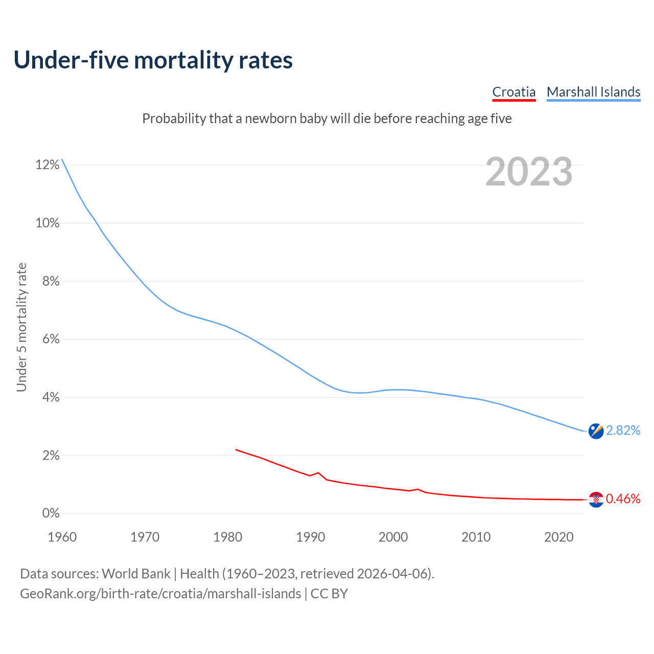 The chance that a newborn baby will die before reaching age five is 0.46% in Croatia and 2.82% in the Marshall Islands. Above is a chart with historical data on under-five mortality rates.