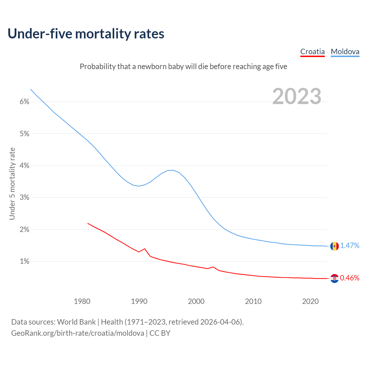 The chance that a newborn baby will die before reaching age five is 0.46% in Croatia and 1.47% in Moldova. Above is a chart with historical data on under-five mortality rates.