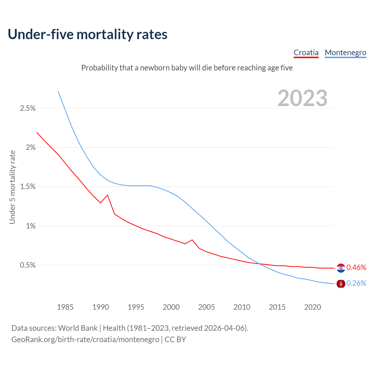 The chance that a newborn baby will die before reaching age five is 0.46% in Croatia and 0.26% in Montenegro. Above is a chart with historical data on under-five mortality rates.