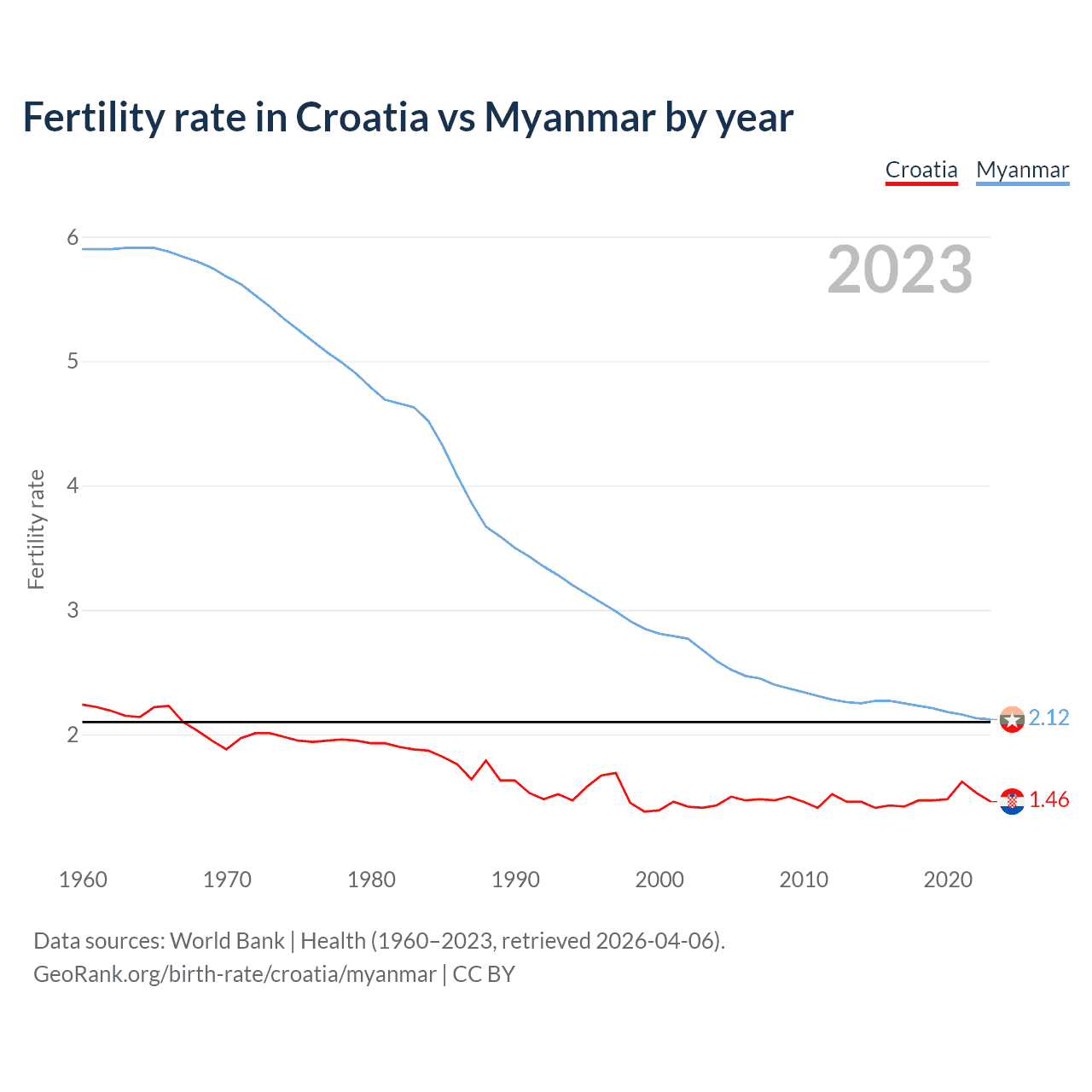 According to the latest available data on birth rates, the fertility rate in Croatia was 1.46 children per woman in 2023, compared to 2.12 in Myanmar in 2023. The replacement level is considered to be 2.1 children per woman.