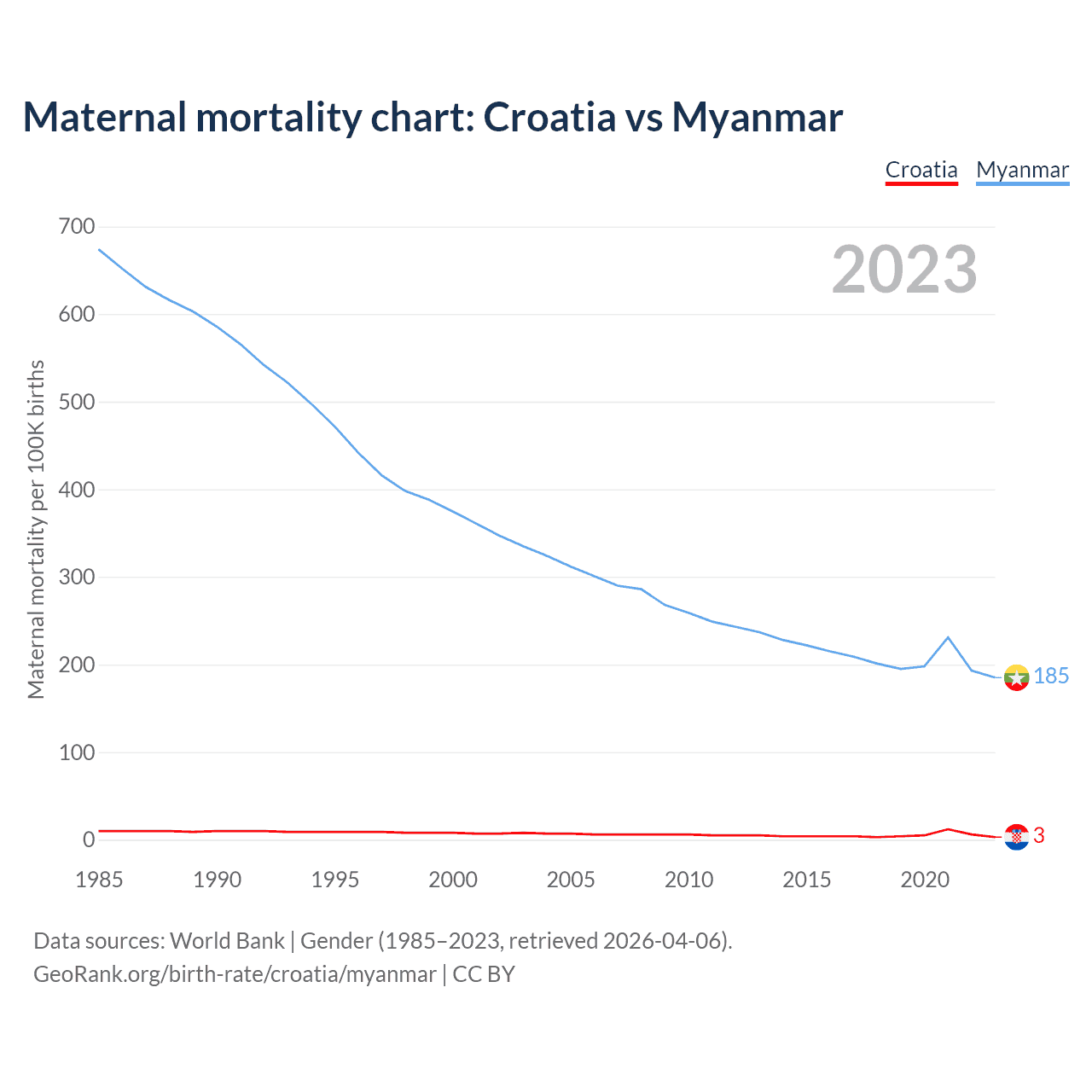 The maternal mortality rate, which is the probability of dying during childbirth or within 42 days of pregnancy termination, is 3 deaths per 100,000 live births in Croatia, compared to 185 deaths in Myanmar.
