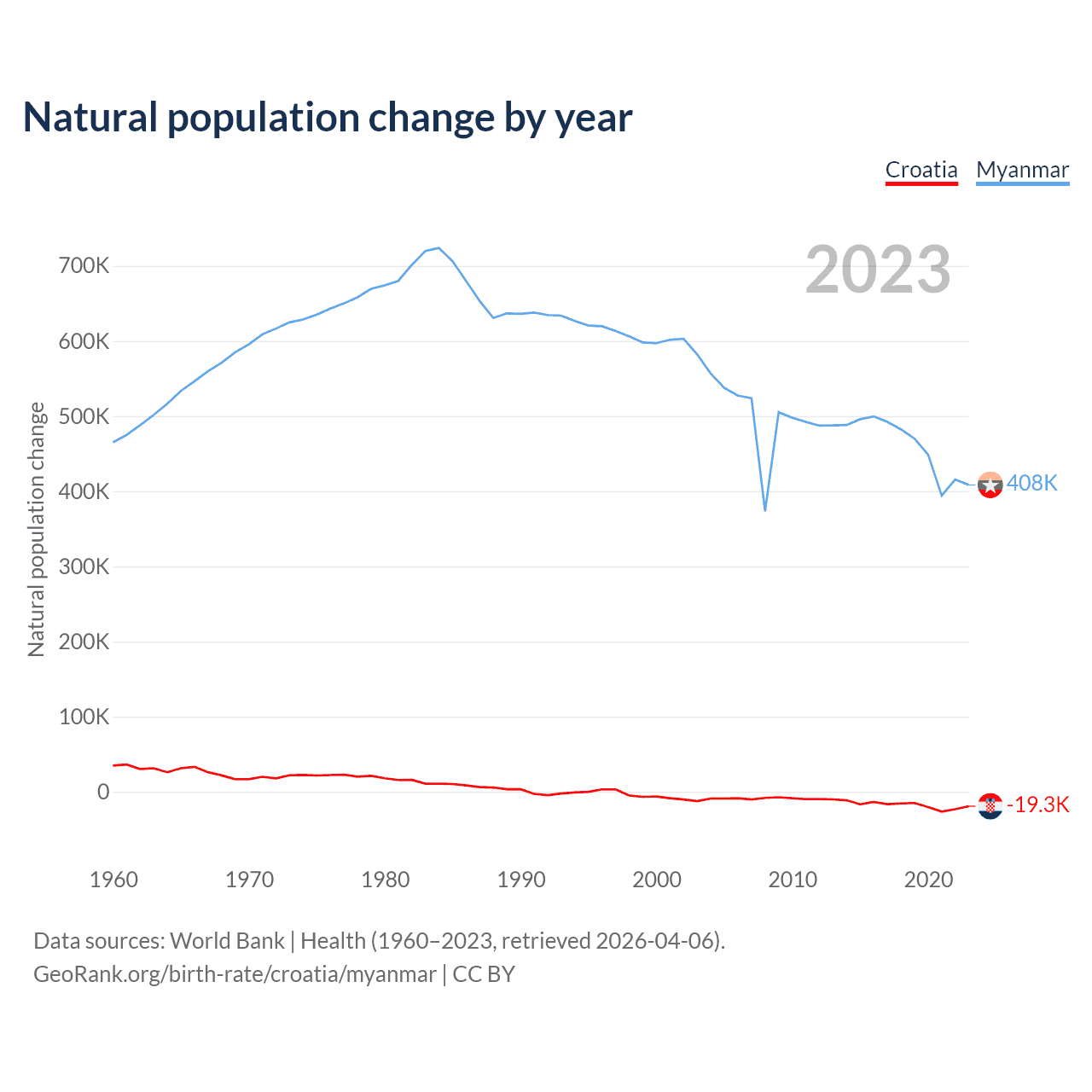 Croatia has an annual birth rate of 8.3 births per 1,000 people, compared to 16.7 for Myanmar. The average number of children a woman is expected to have during her lifetime — the fertility rate, is 1.46 in Croatia and 2.12 in Myanmar — 44.9% difference.