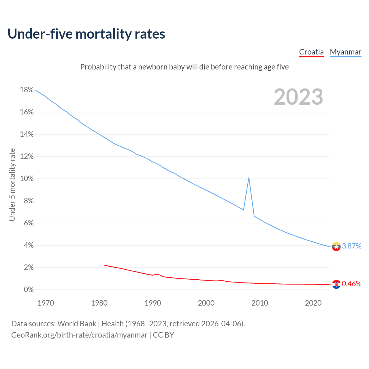 The chance that a newborn baby will die before reaching age five is 0.46% in Croatia and 3.87% in Myanmar. Above is a chart with historical data on under-five mortality rates.