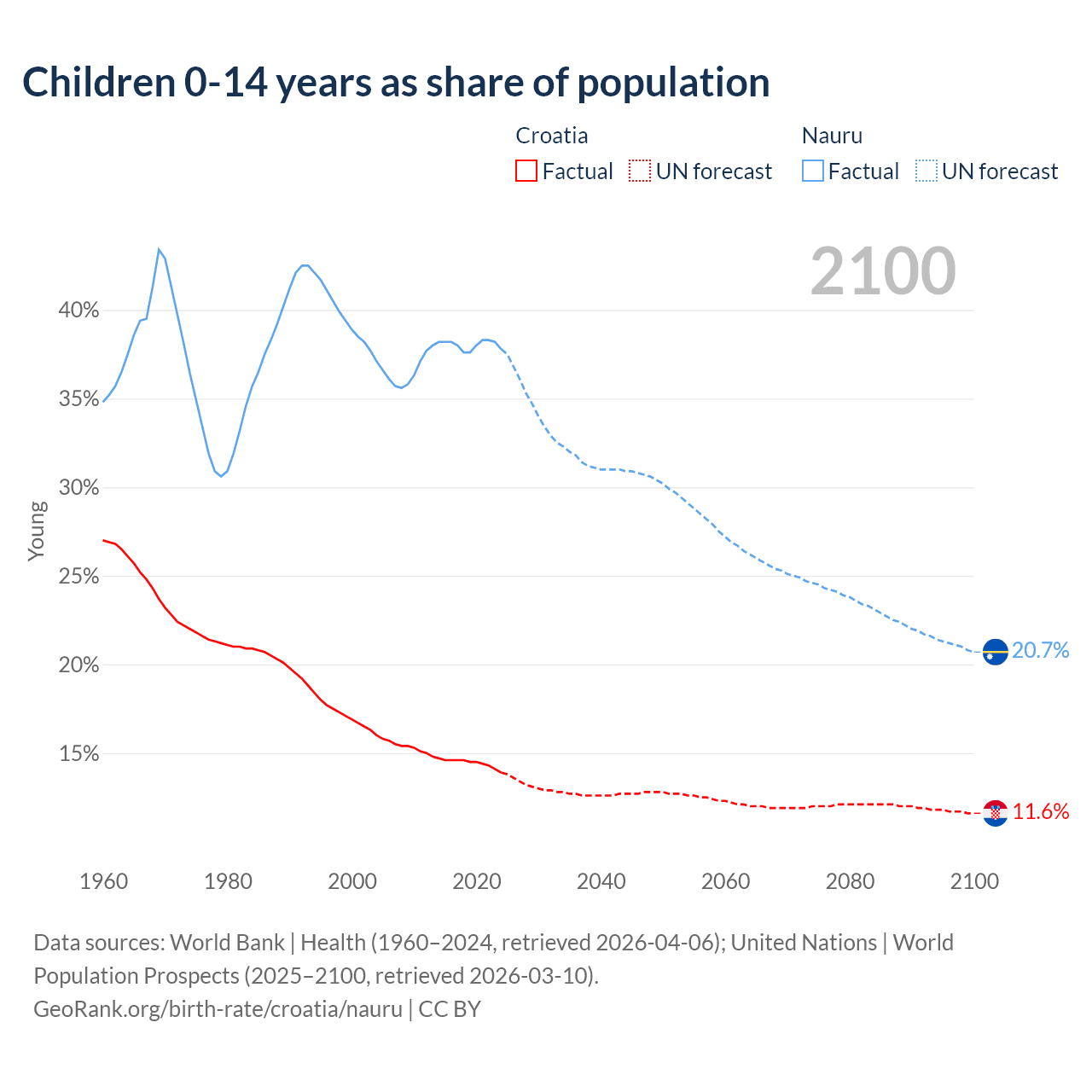 Croatia has an annual birth rate of 8.3 births per 1,000 people, compared to 25.5 for Nauru. The average number of children a woman is expected to have during her lifetime — the fertility rate, is 1.46 in Croatia and 3.33 in Nauru — 128.2% difference.