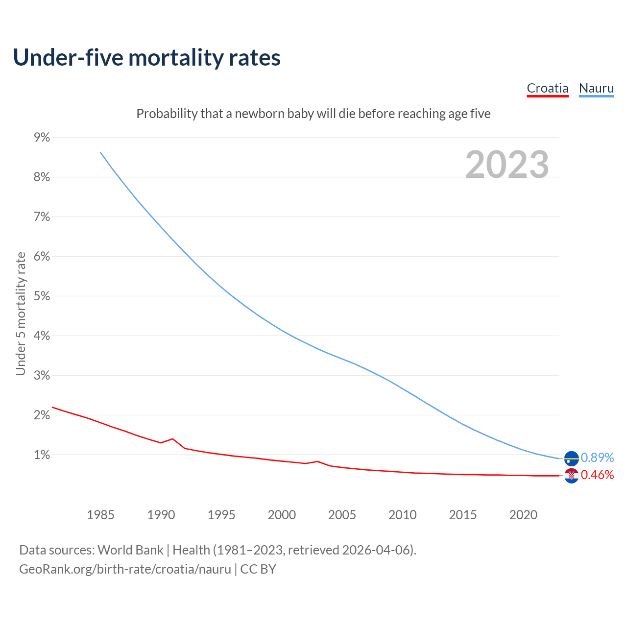 The chance that a newborn baby will die before reaching age five is 0.46% in Croatia and 0.89% in Nauru. Above is a chart with historical data on under-five mortality rates.