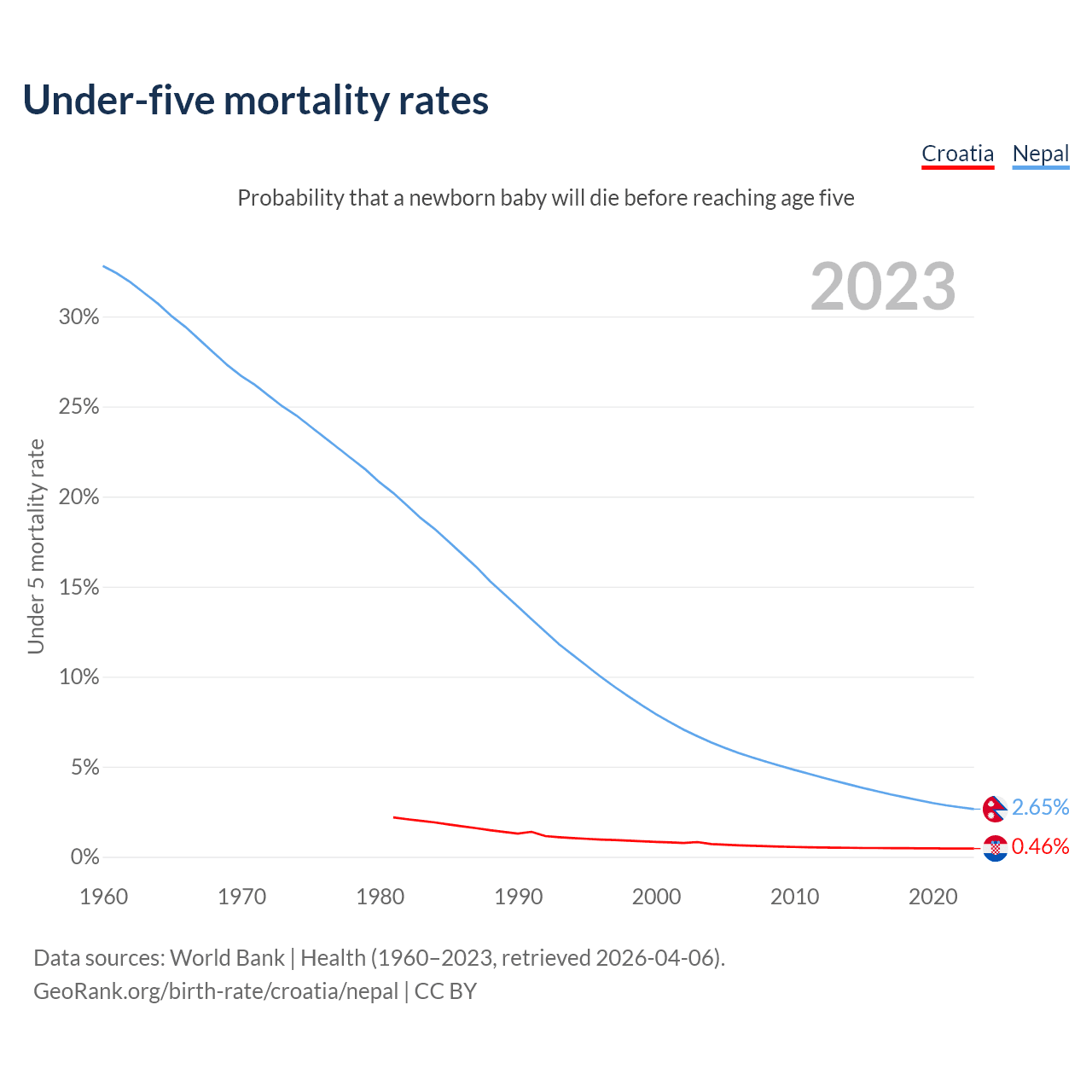 The chance that a newborn baby will die before reaching age five is 0.46% in Croatia and 2.65% in Nepal. Above is a chart with historical data on under-five mortality rates.