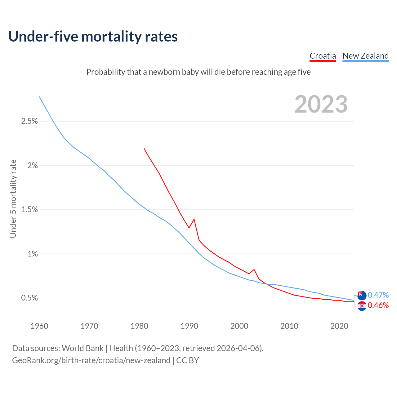 The chance that a newborn baby will die before reaching age five is 0.46% in Croatia and 0.47% in New Zealand. Above is a chart with historical data on under-five mortality rates.