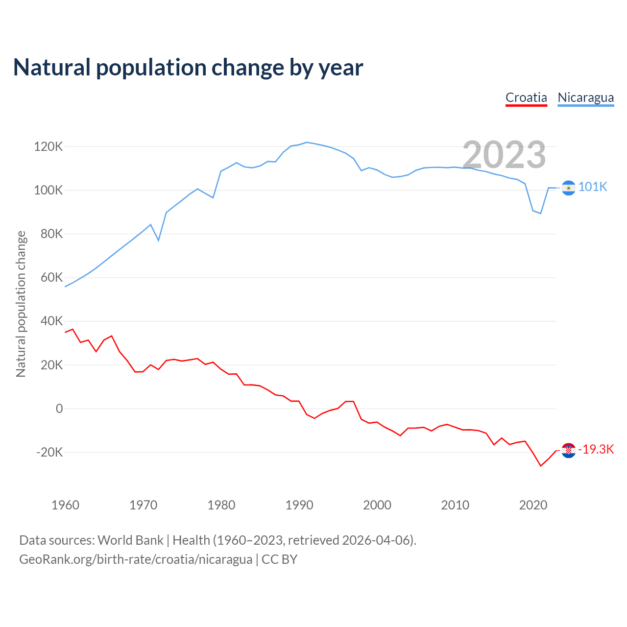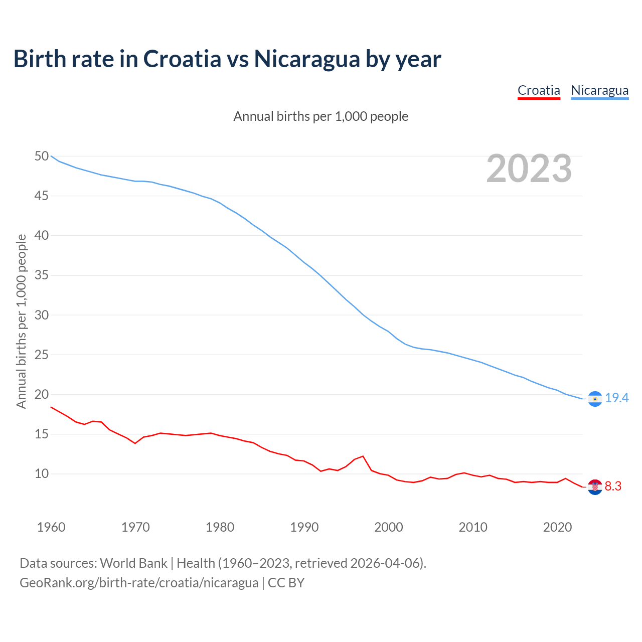 Croatia has an annual birth rate of 8.3 births per 1,000 people, compared to 19.4 for Nicaragua. The average number of children a woman is expected to have during her lifetime — the fertility rate, is 1.46 in Croatia and 2.22 in Nicaragua — 51.9% difference.