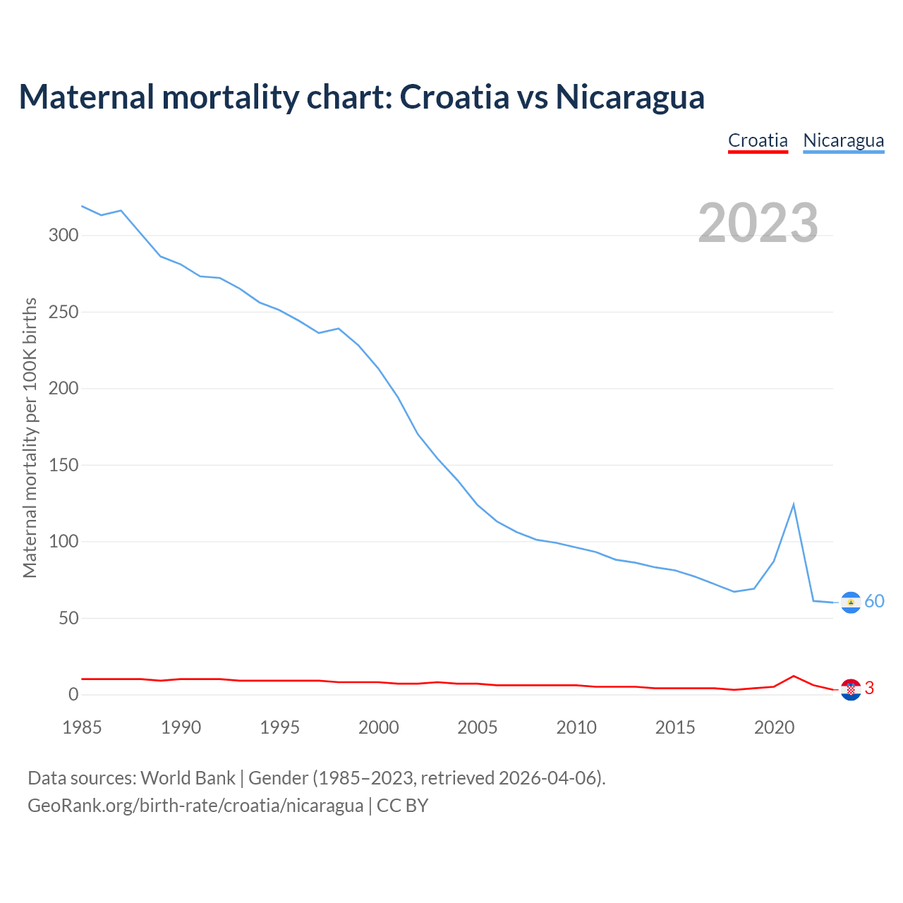 The maternal mortality rate, which is the probability of dying during childbirth or within 42 days of pregnancy termination, is 3 deaths per 100,000 live births in Croatia, compared to 60 deaths in Nicaragua.