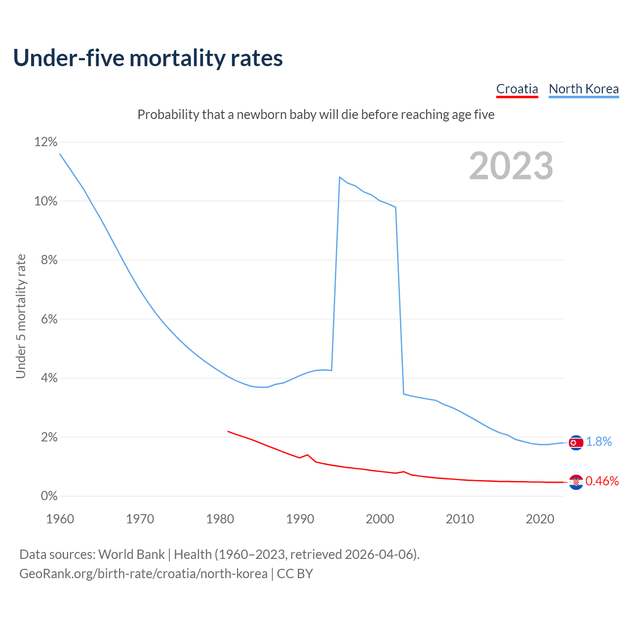 The chance that a newborn baby will die before reaching age five is 0.46% in Croatia and 1.8% in North Korea. Above is a chart with historical data on under-five mortality rates.