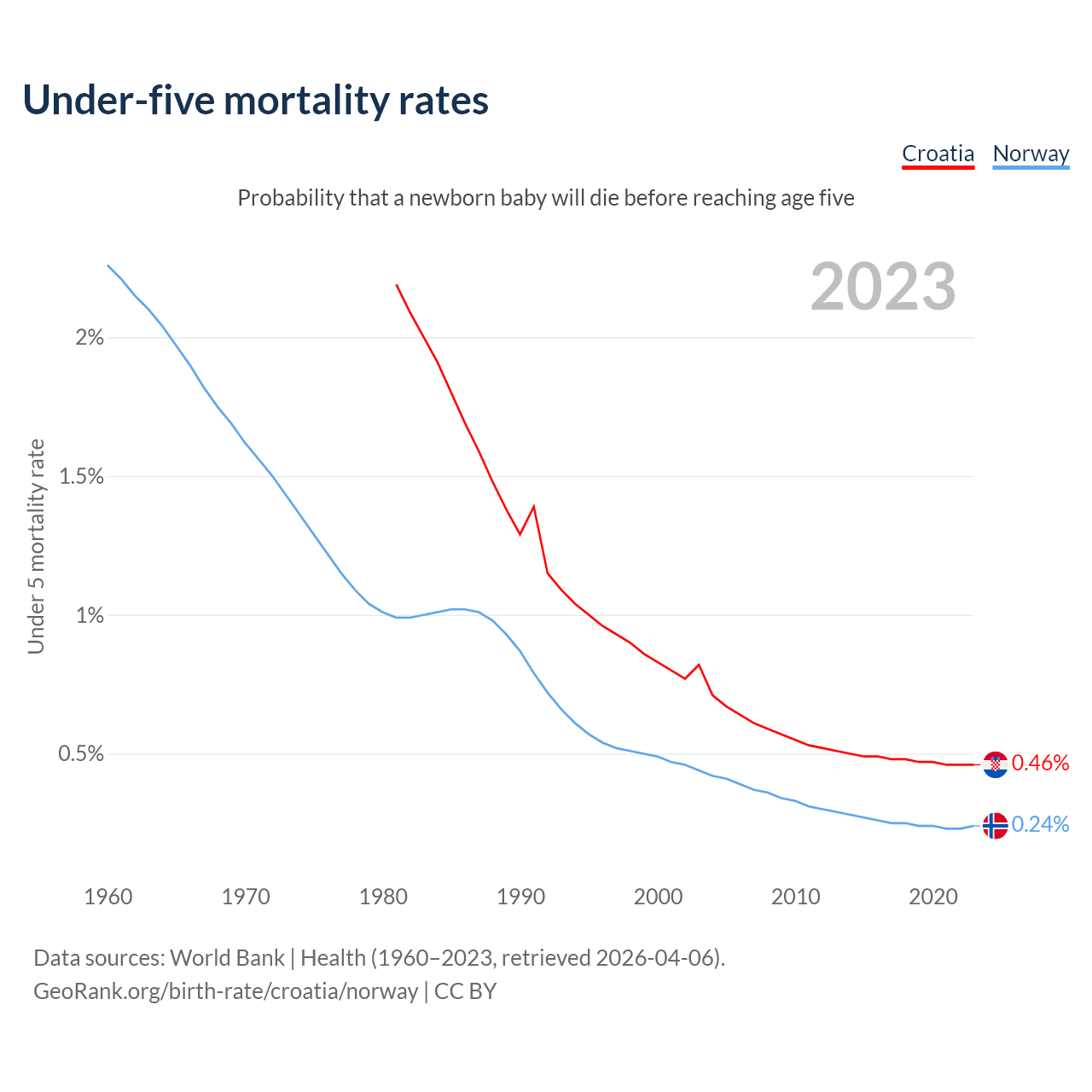The chance that a newborn baby will die before reaching age five is 0.46% in Croatia and 0.24% in Norway. Above is a chart with historical data on under-five mortality rates.