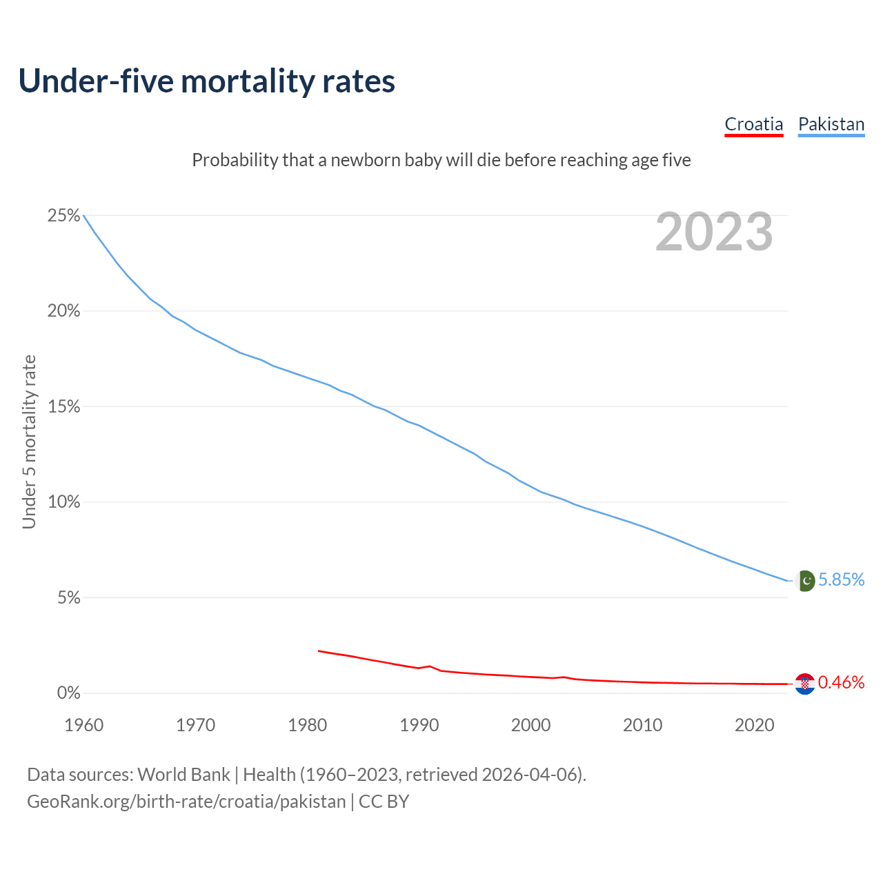 The chance that a newborn baby will die before reaching age five is 0.46% in Croatia and 5.85% in Pakistan. Above is a chart with historical data on under-five mortality rates.
