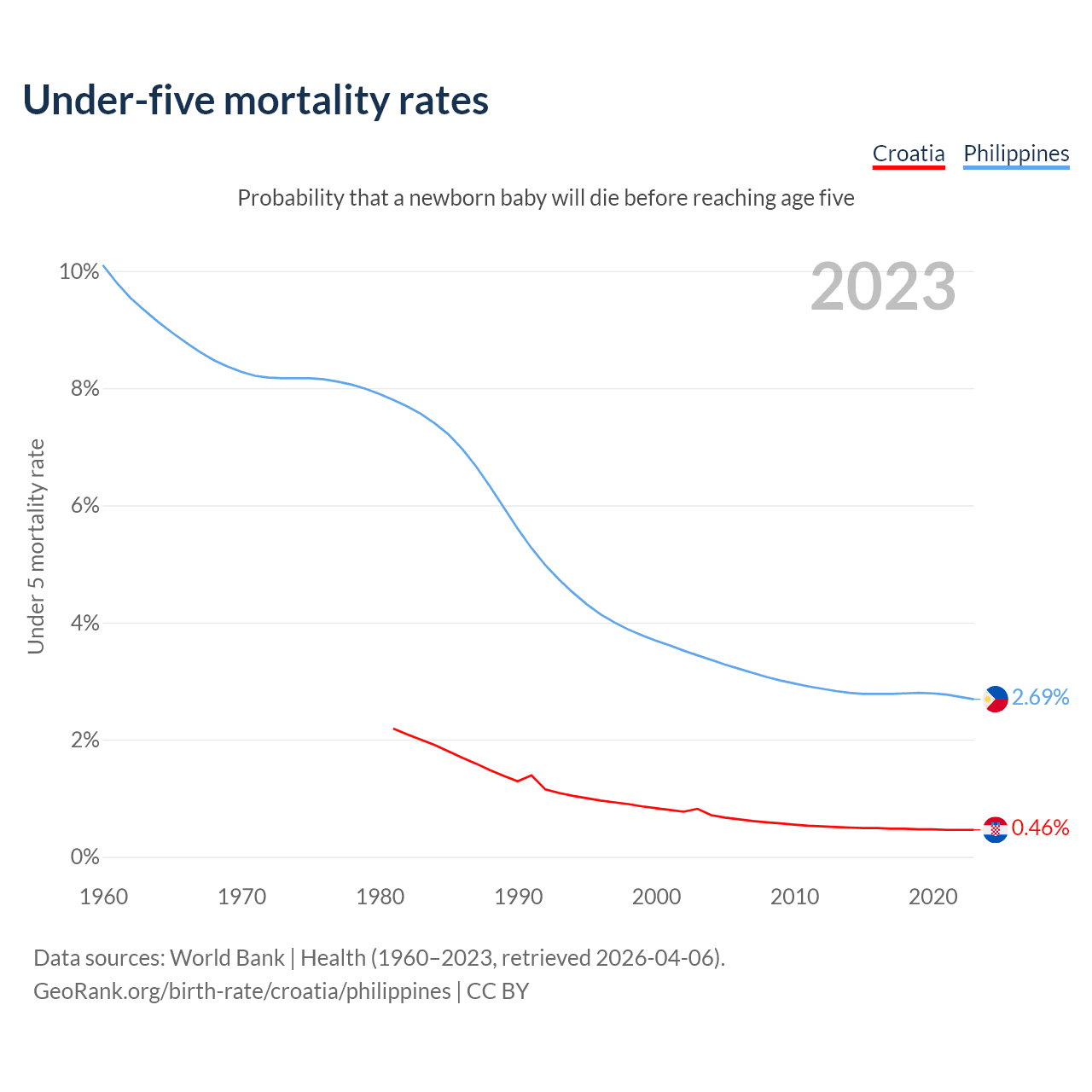 The chance that a newborn baby will die before reaching age five is 0.46% in Croatia and 2.69% in the Philippines. Above is a chart with historical data on under-five mortality rates.