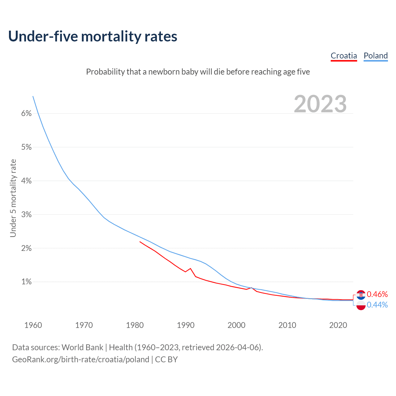 The chance that a newborn baby will die before reaching age five is 0.46% in Croatia and 0.44% in Poland. Above is a chart with historical data on under-five mortality rates.