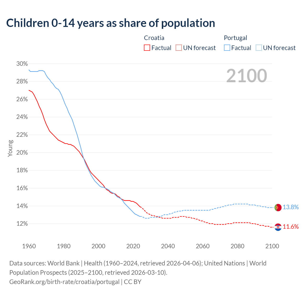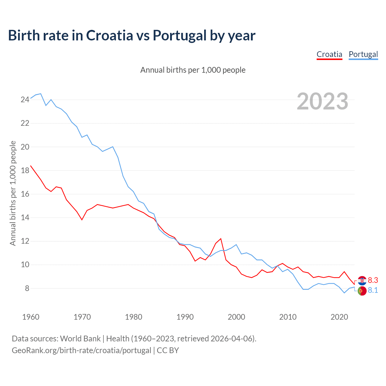 Croatia has an annual birth rate of 8.3 births per 1,000 people, compared to 8.1 for Portugal. The average number of children a woman is expected to have during her lifetime — the fertility rate, is 1.46 in Croatia and 1.44 in Portugal — 1.37% difference.