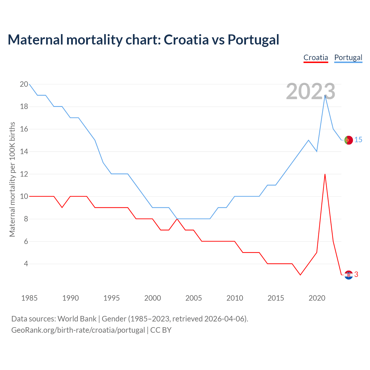 The maternal mortality rate, which is the probability of dying during childbirth or within 42 days of pregnancy termination, is 3 deaths per 100,000 live births in Croatia, compared to 15 deaths in Portugal.