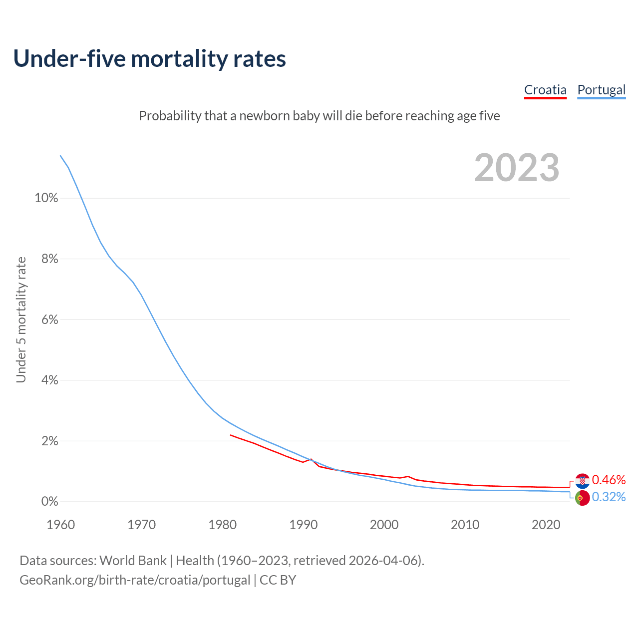 The chance that a newborn baby will die before reaching age five is 0.46% in Croatia and 0.32% in Portugal. Above is a chart with historical data on under-five mortality rates.