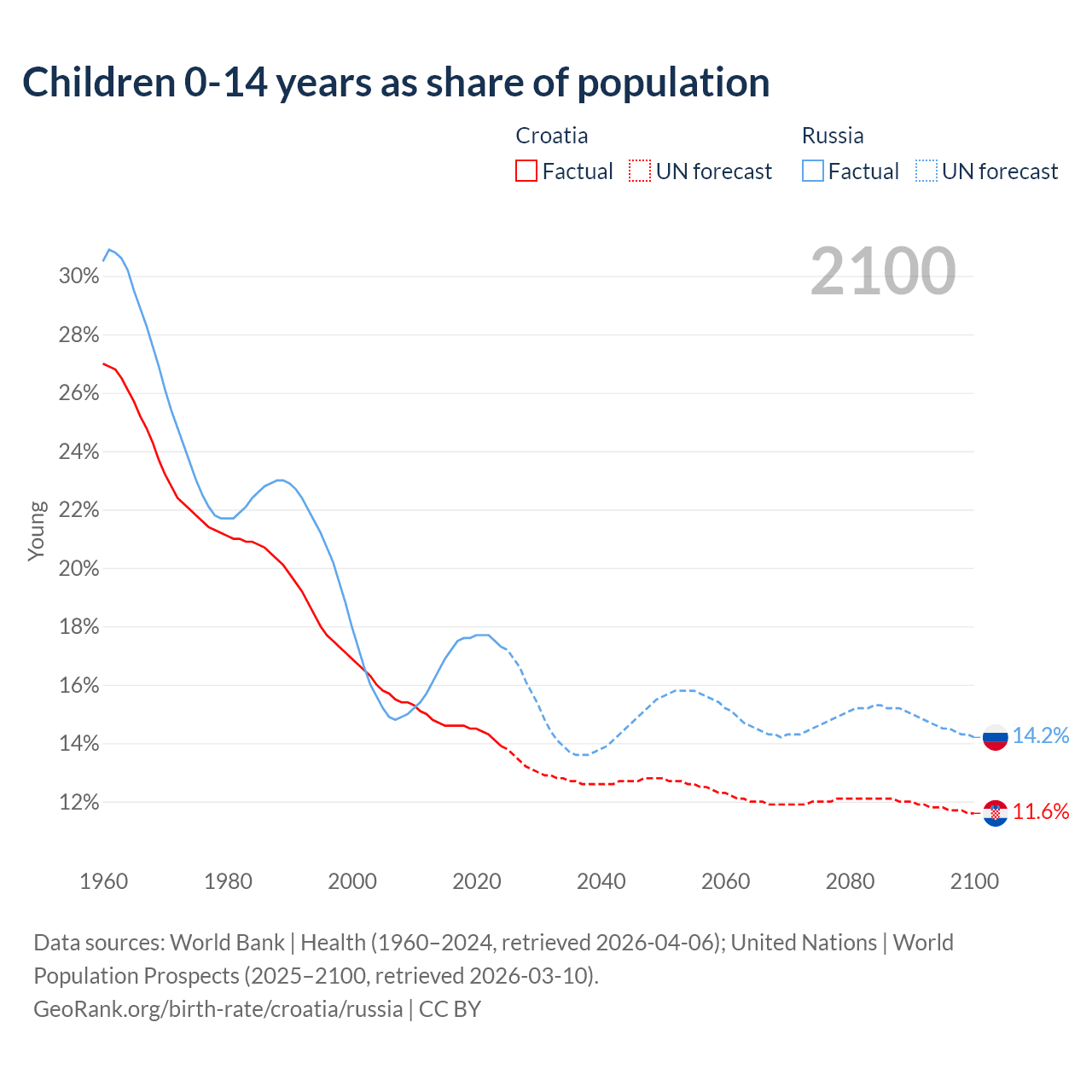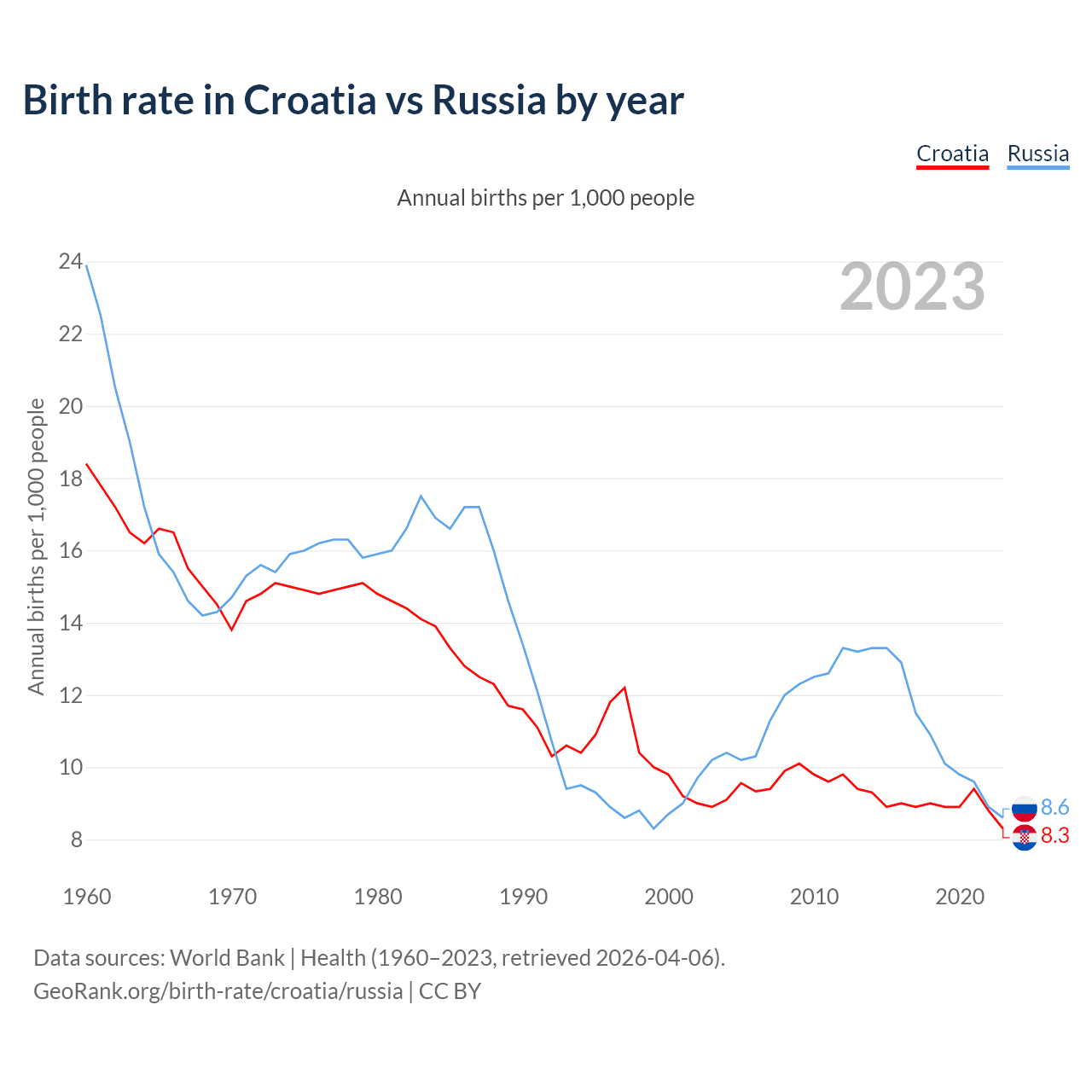 Croatia has an annual birth rate of 8.3 births per 1,000 people, compared to 8.6 for Russia. The average number of children a woman is expected to have during her lifetime — the fertility rate, is 1.46 in Croatia and 1.41 in Russia — 3.42% difference.