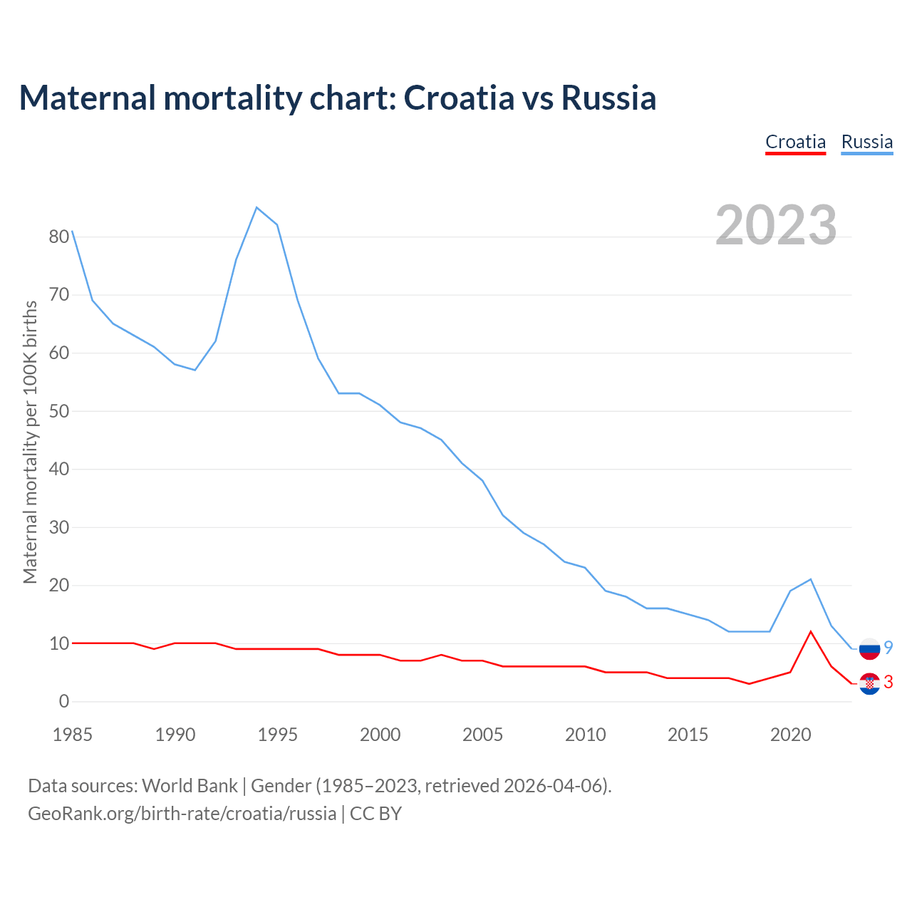 The maternal mortality rate, which is the probability of dying during childbirth or within 42 days of pregnancy termination, is 3 deaths per 100,000 live births in Croatia, compared to 9 deaths in Russia.