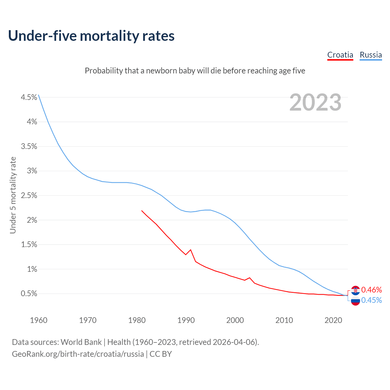 The chance that a newborn baby will die before reaching age five is 0.46% in Croatia and 0.45% in Russia. Above is a chart with historical data on under-five mortality rates.