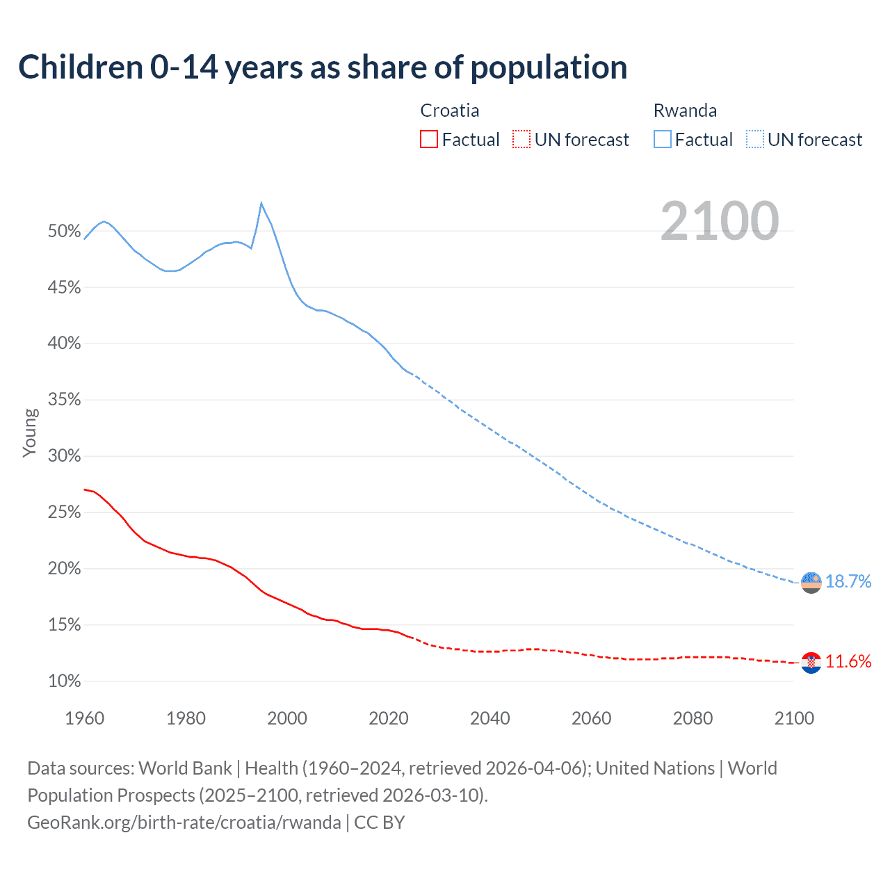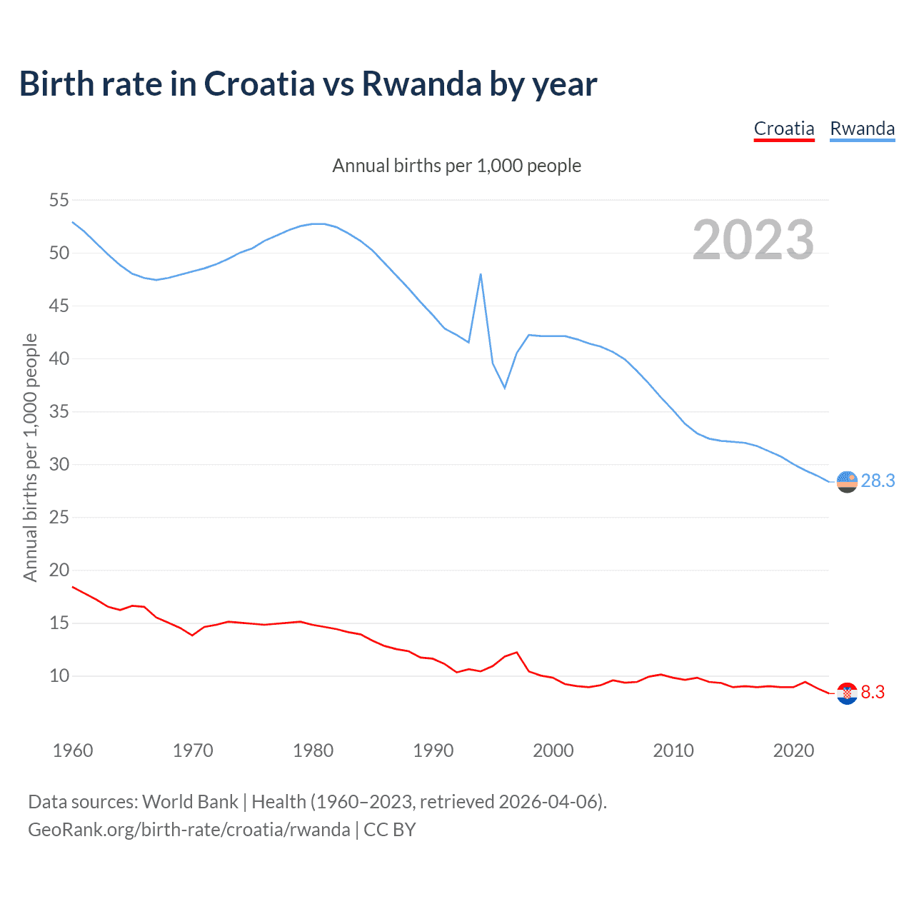 Croatia has an annual birth rate of 8.3 births per 1,000 people, compared to 28.3 for Rwanda. The average number of children a woman is expected to have during her lifetime — the fertility rate, is 1.46 in Croatia and 3.7 in Rwanda — 153.3% difference.