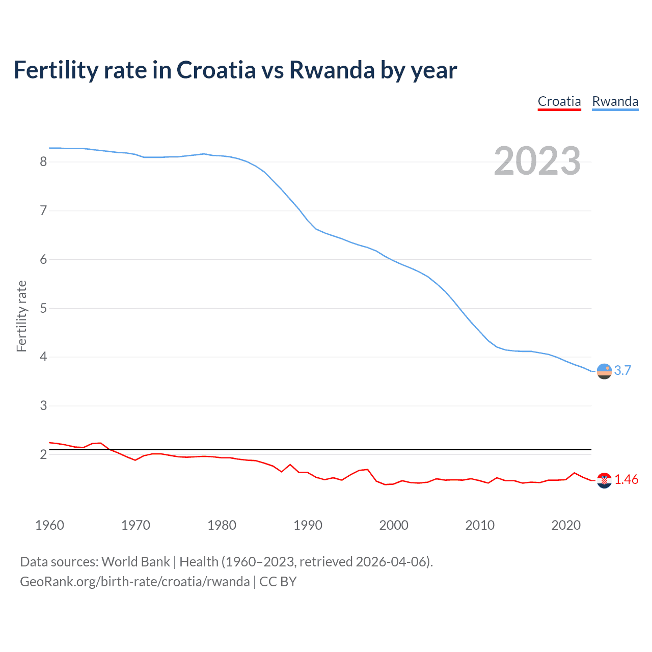 According to the latest available data on birth rates, the fertility rate in Croatia was 1.46 children per woman in 2023, compared to 3.7 in Rwanda in 2023. The replacement level is considered to be 2.1 children per woman.