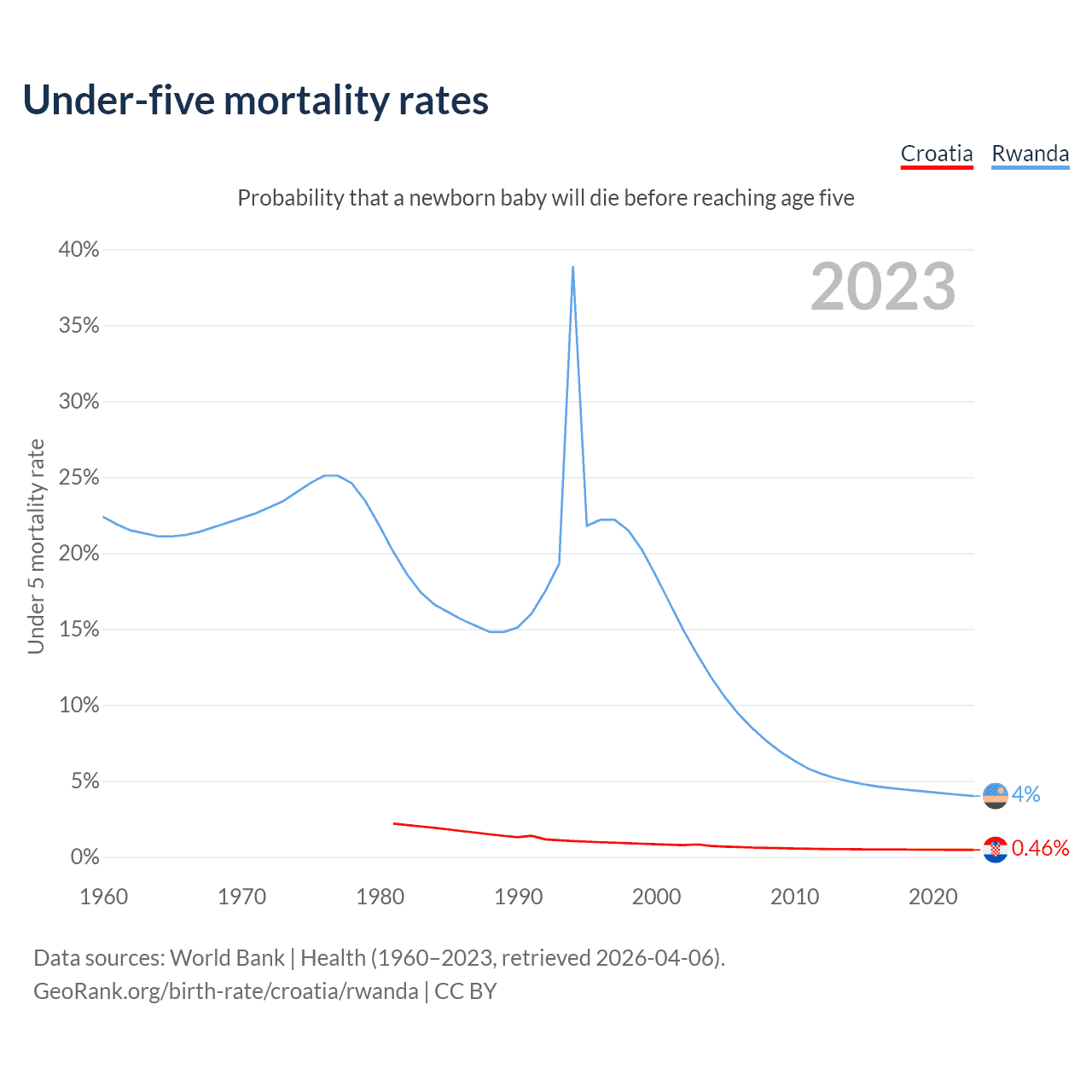 The chance that a newborn baby will die before reaching age five is 0.46% in Croatia and 4% in Rwanda. Above is a chart with historical data on under-five mortality rates.