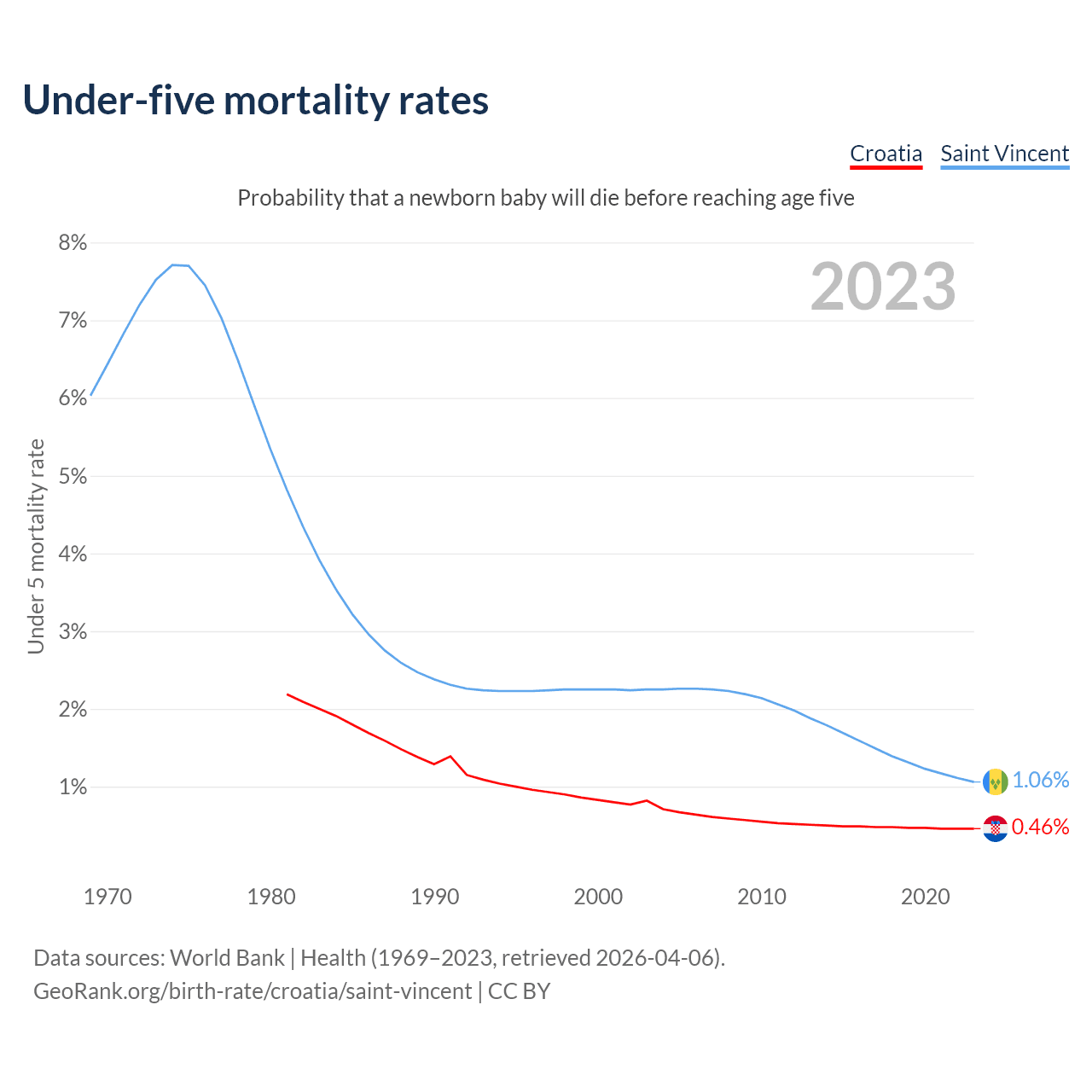 The chance that a newborn baby will die before reaching age five is 0.46% in Croatia and 1.06% in Saint Vincent. Above is a chart with historical data on under-five mortality rates.