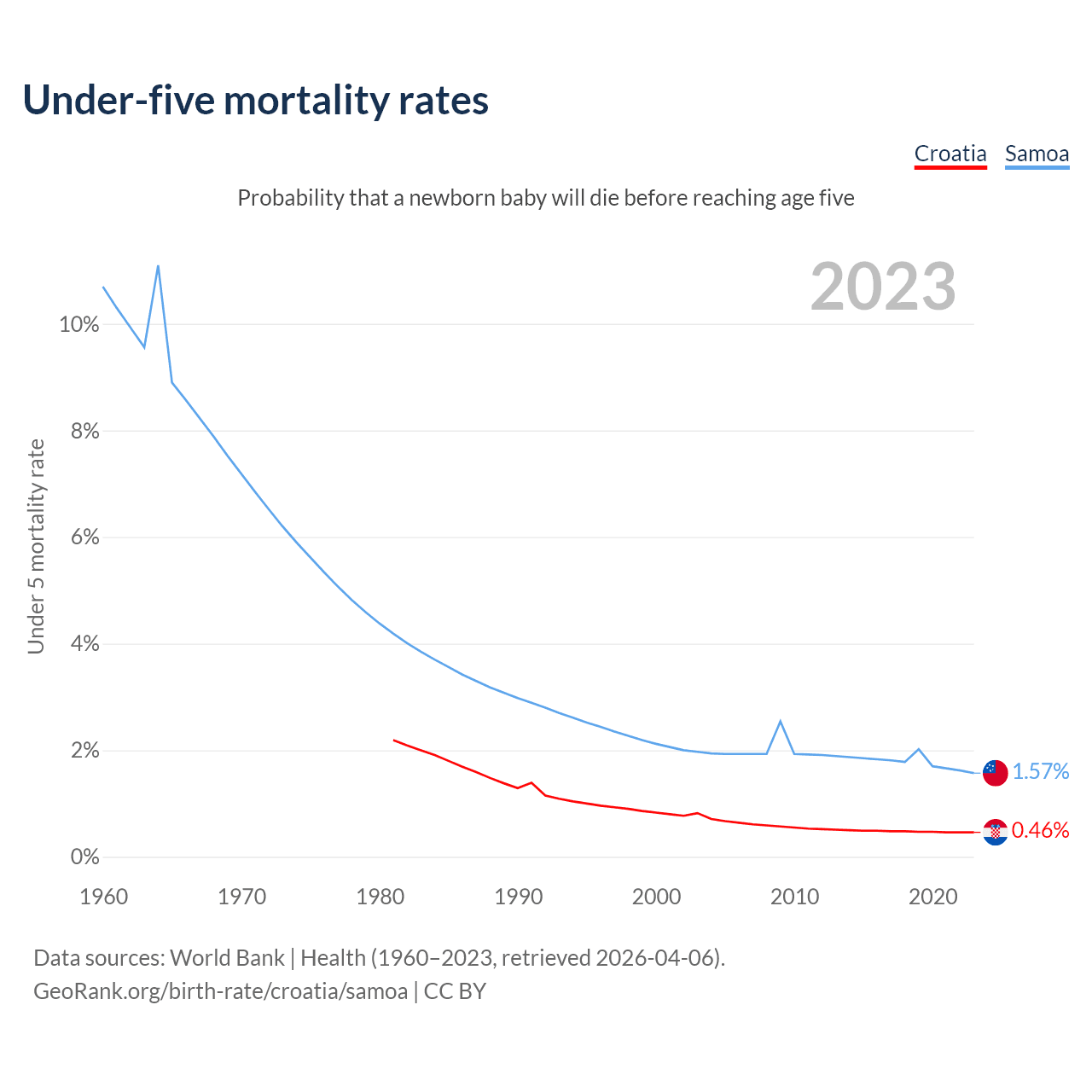 The chance that a newborn baby will die before reaching age five is 0.46% in Croatia and 1.57% in Samoa. Above is a chart with historical data on under-five mortality rates.