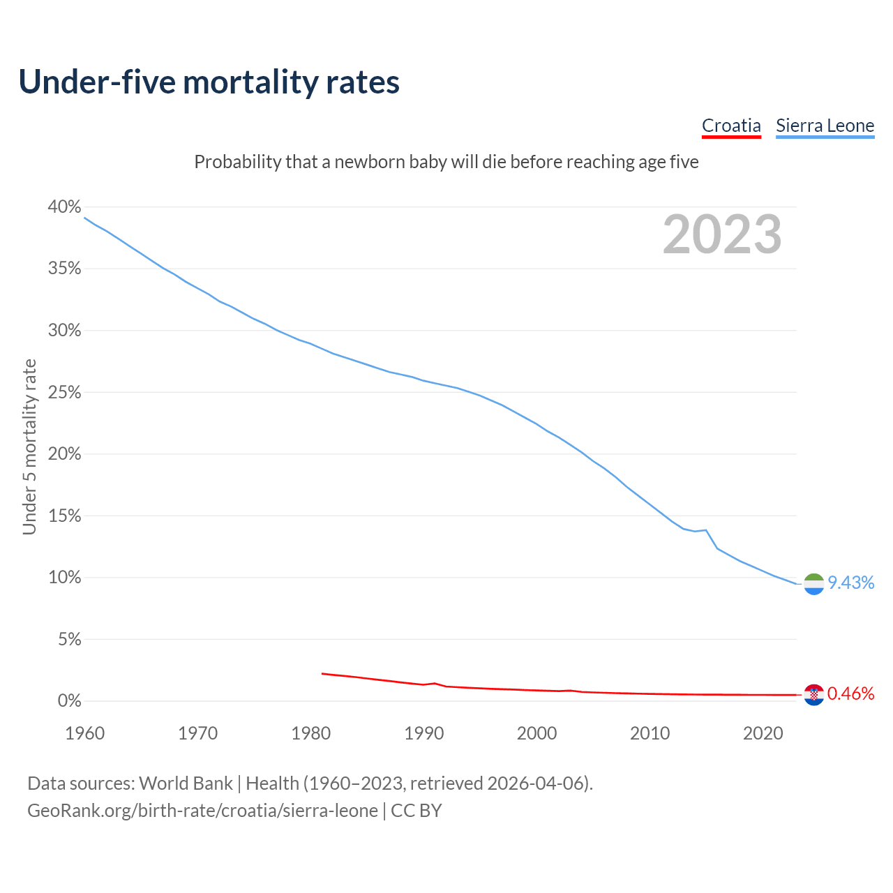 The chance that a newborn baby will die before reaching age five is 0.46% in Croatia and 9.43% in Sierra Leone. Above is a chart with historical data on under-five mortality rates.
