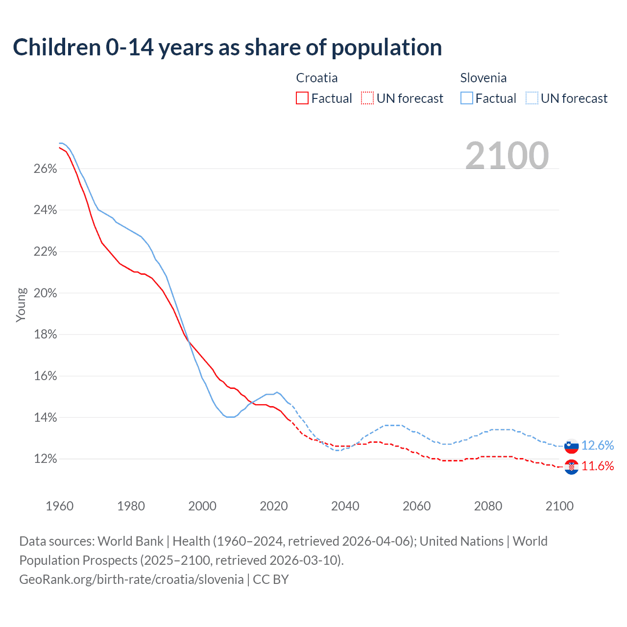 According to the latest available data on birth rates, the fertility rate in Croatia was 1.46 children per woman in 2023, compared to 1.51 in Slovenia in 2023. The replacement level is considered to be 2.1 children per woman.