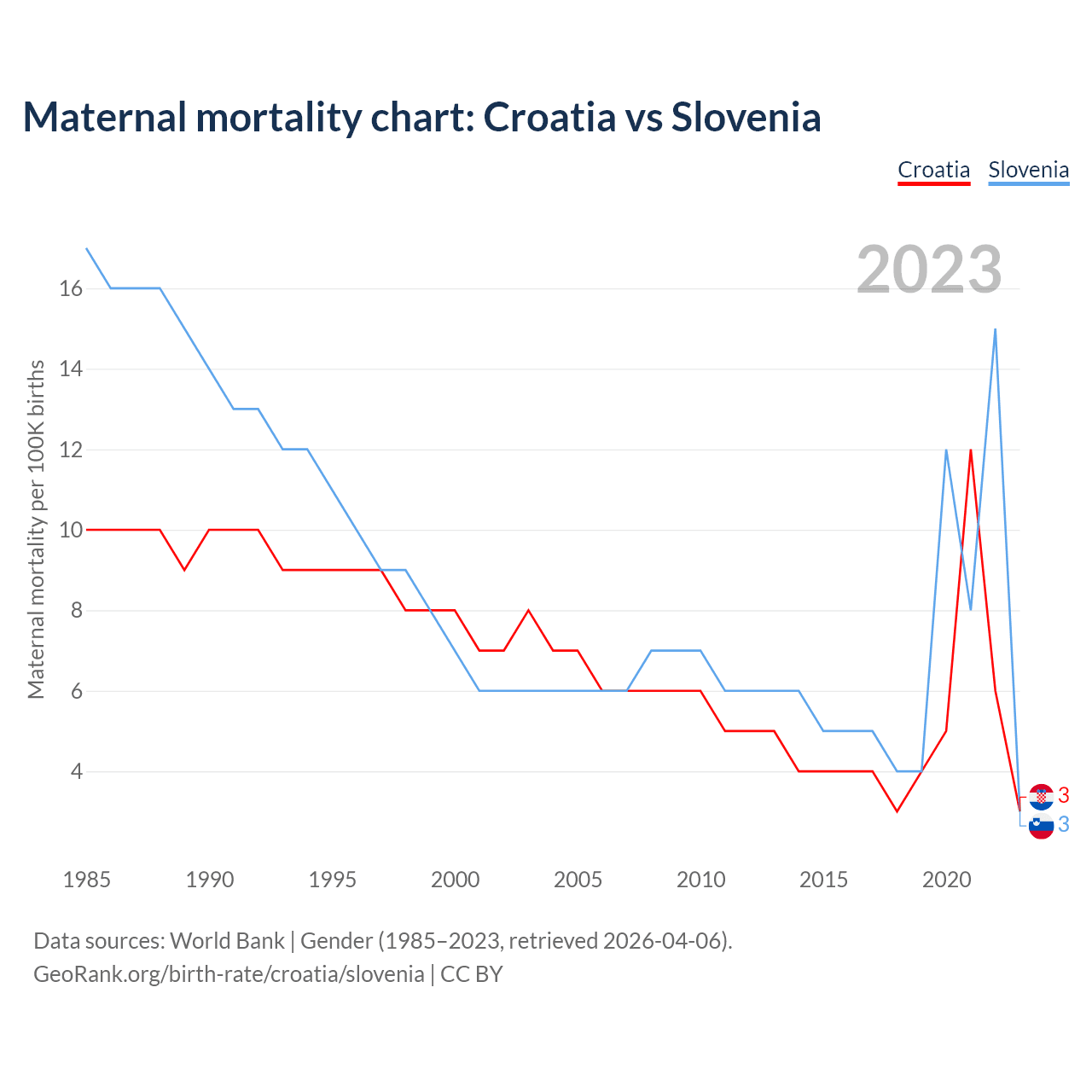 The maternal mortality rate, which is the probability of dying during childbirth or within 42 days of pregnancy termination, is 3 deaths per 100,000 live births in Croatia, compared to 3 deaths in Slovenia.