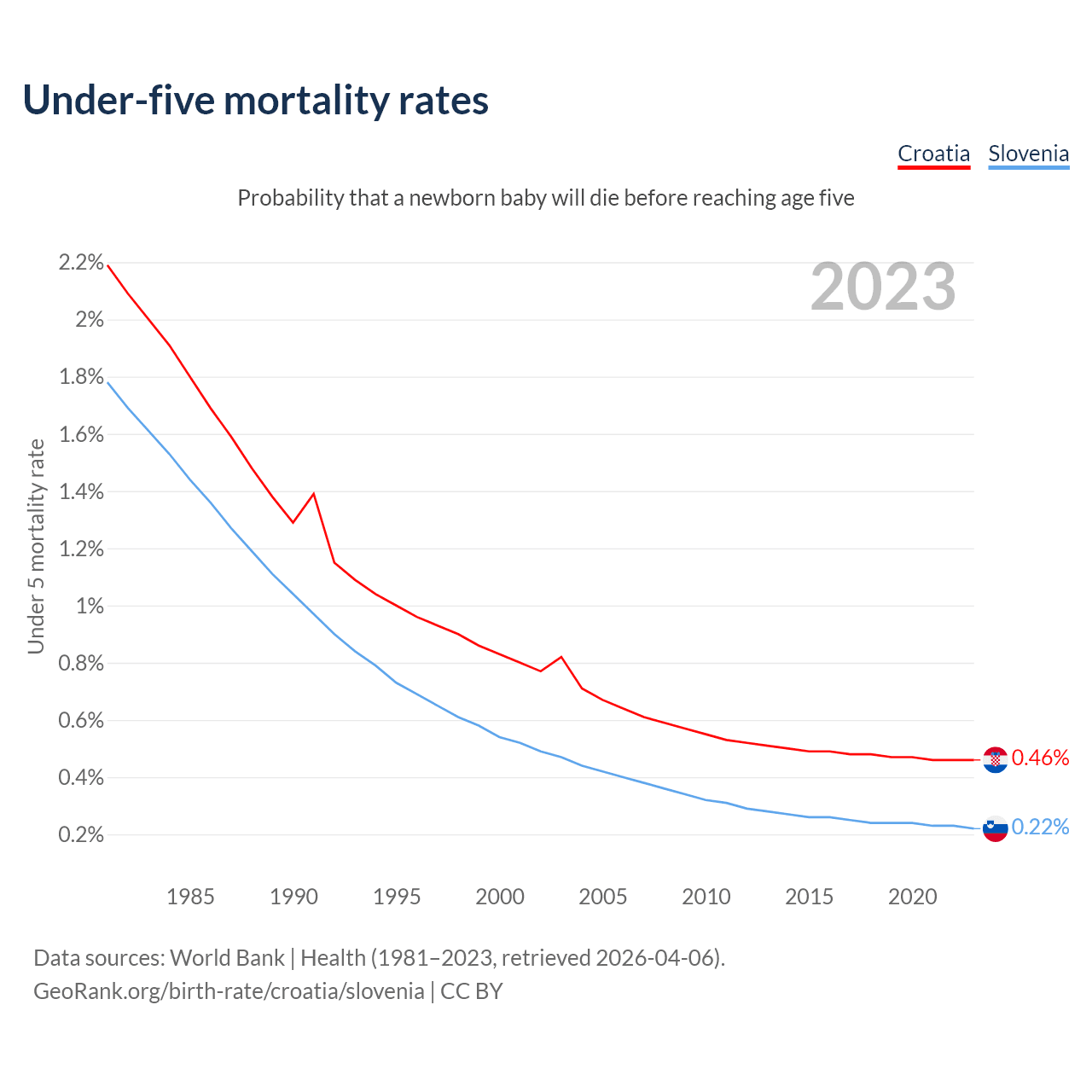 The chance that a newborn baby will die before reaching age five is 0.46% in Croatia and 0.22% in Slovenia. Above is a chart with historical data on under-five mortality rates.