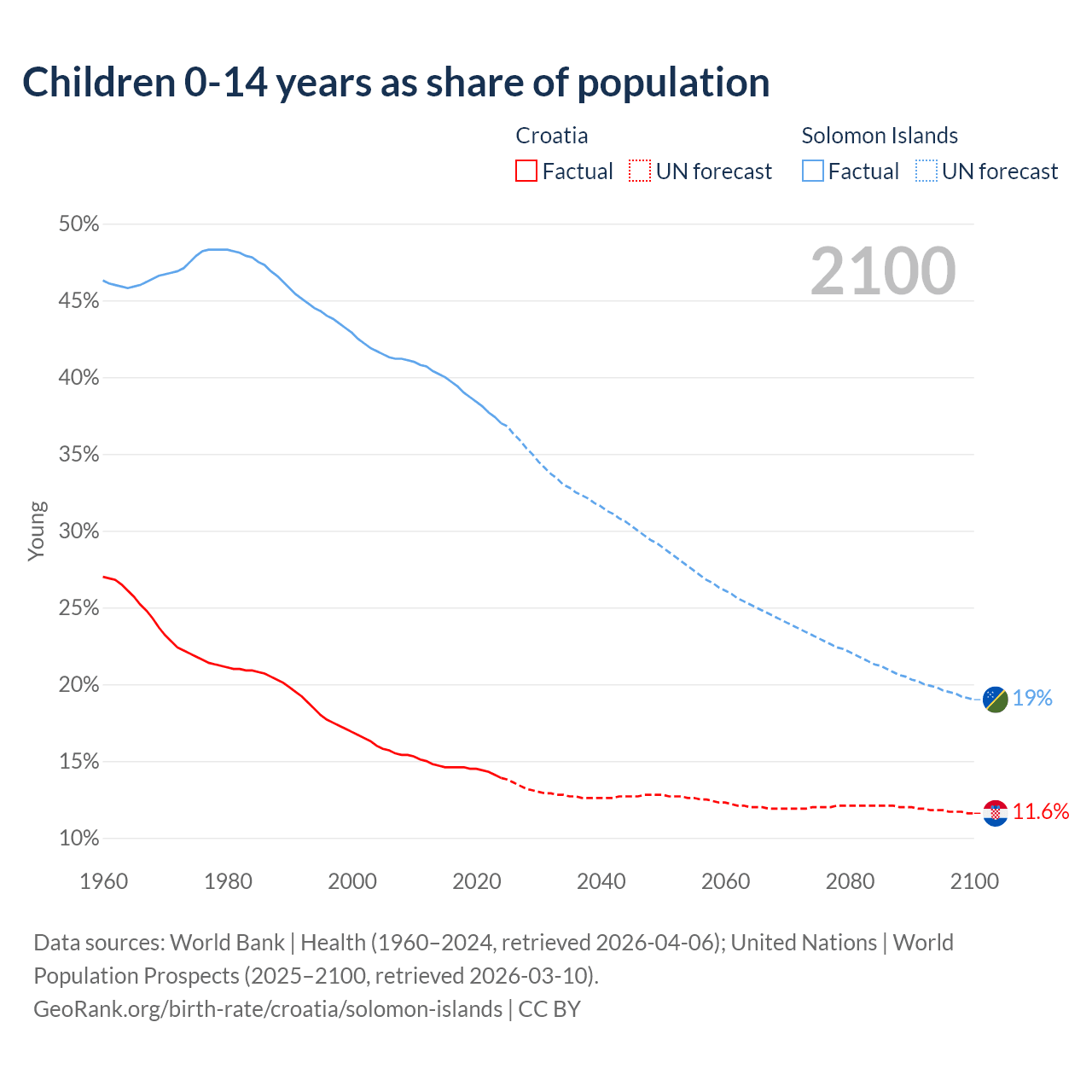 Croatia has an annual birth rate of 8.3 births per 1,000 people, compared to 26.9 for the Solomon Islands. The average number of children a woman is expected to have during her lifetime — the fertility rate, is 1.46 in Croatia and 3.56 in the Solomon Islands — 143.6% difference.