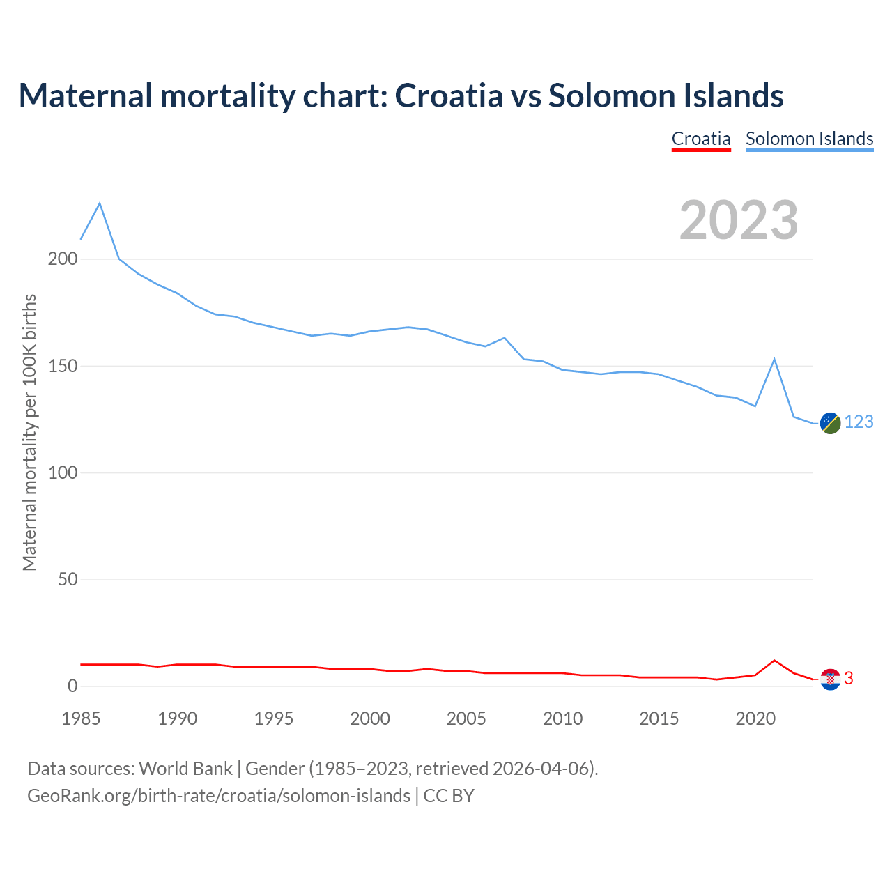 The maternal mortality rate, which is the probability of dying during childbirth or within 42 days of pregnancy termination, is 3 deaths per 100,000 live births in Croatia, compared to 123 deaths in the Solomon Islands.