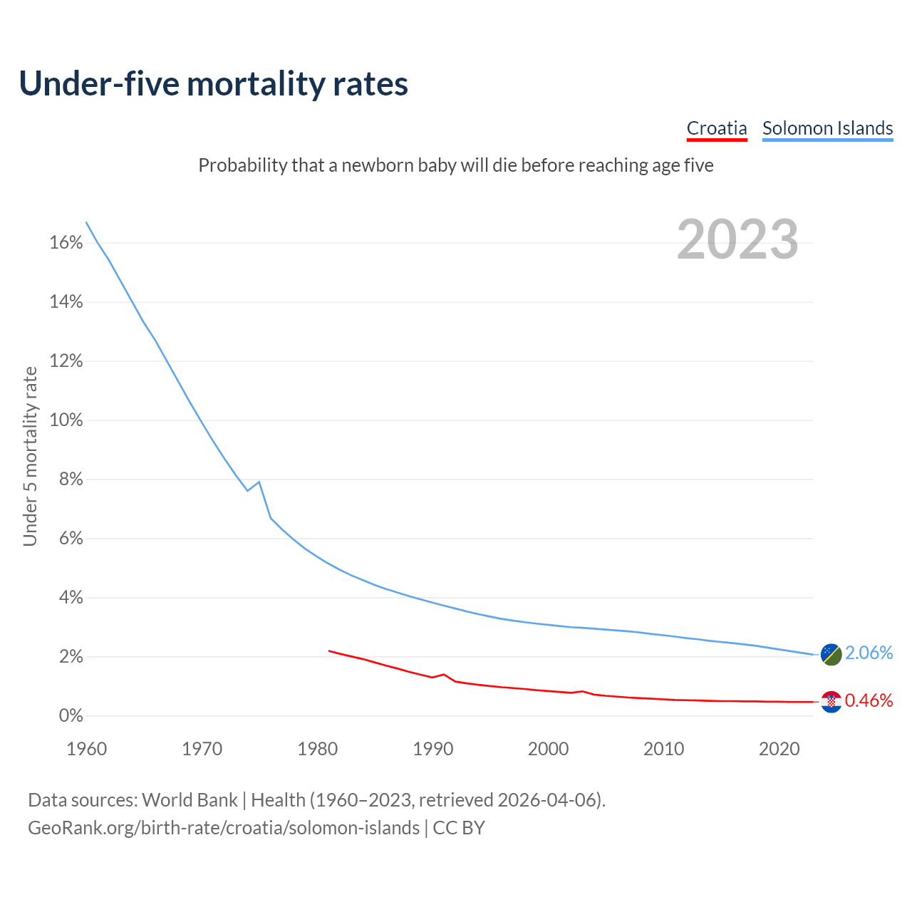 The chance that a newborn baby will die before reaching age five is 0.46% in Croatia and 2.06% in the Solomon Islands. Above is a chart with historical data on under-five mortality rates.