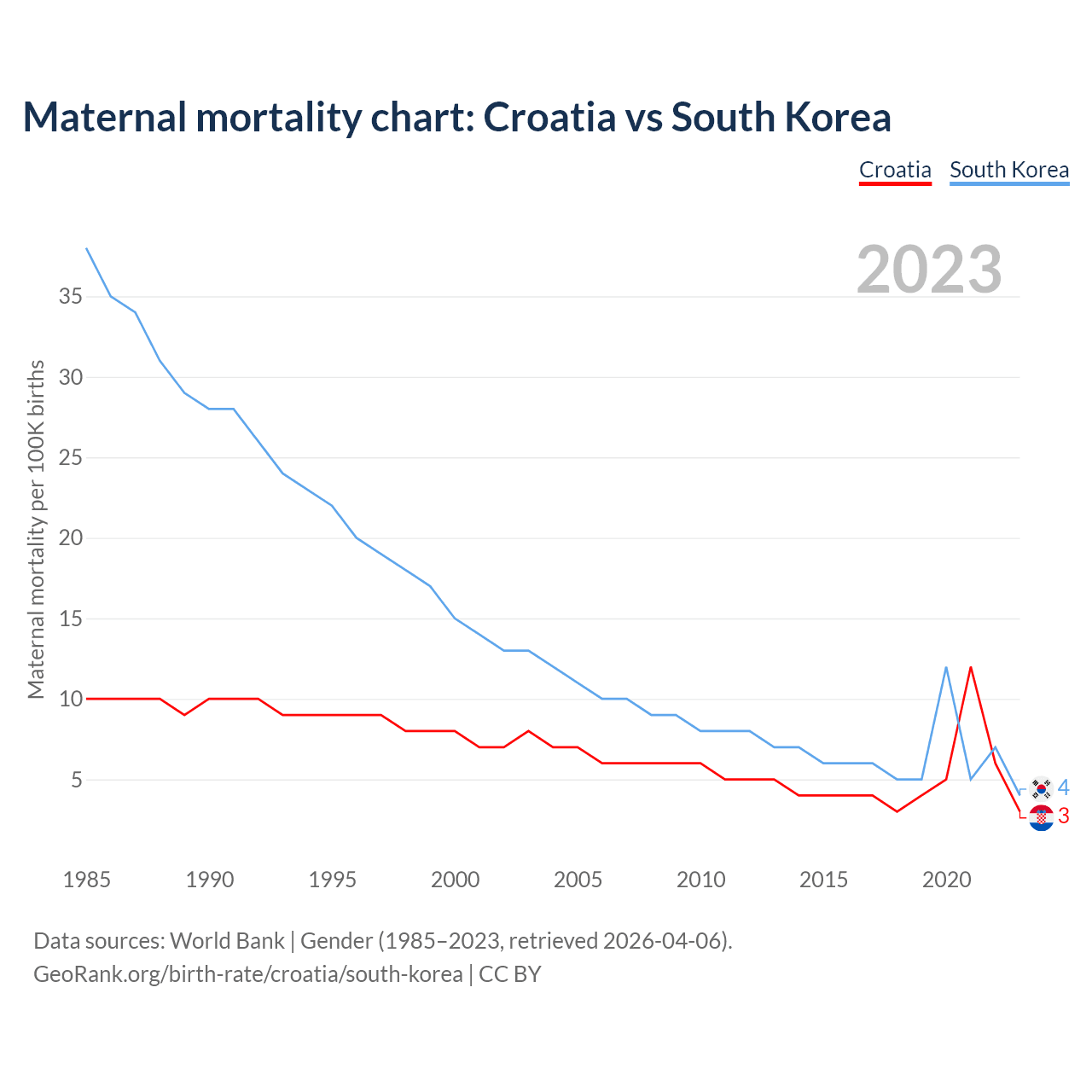 The maternal mortality rate, which is the probability of dying during childbirth or within 42 days of pregnancy termination, is 3 deaths per 100,000 live births in Croatia, compared to 4 deaths in South Korea.