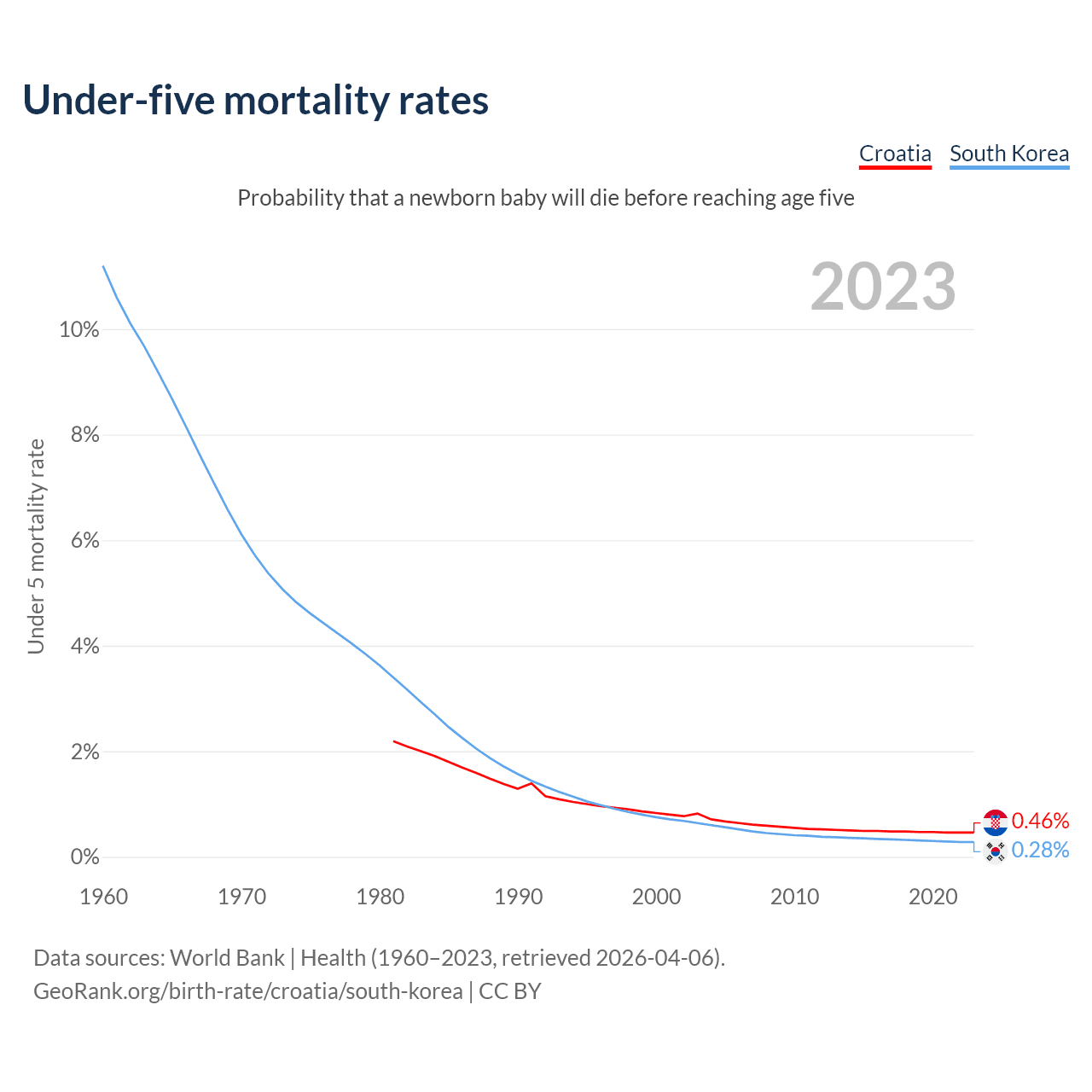 The chance that a newborn baby will die before reaching age five is 0.46% in Croatia and 0.28% in South Korea. Above is a chart with historical data on under-five mortality rates.
