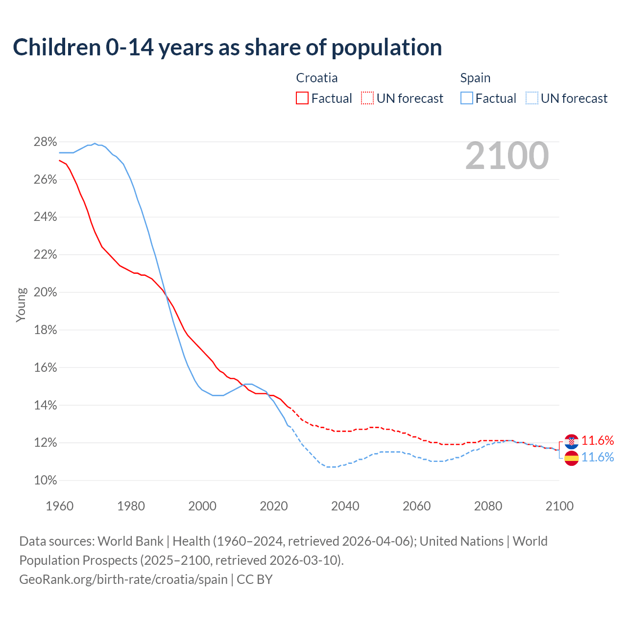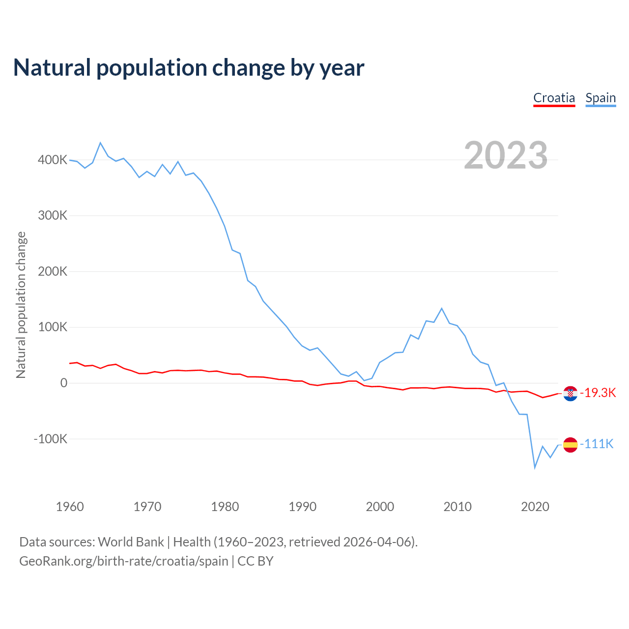 According to the latest available data on birth rates, the fertility rate in Croatia was 1.46 children per woman in 2023, compared to 1.12 in Spain in 2023. The replacement level is considered to be 2.1 children per woman.