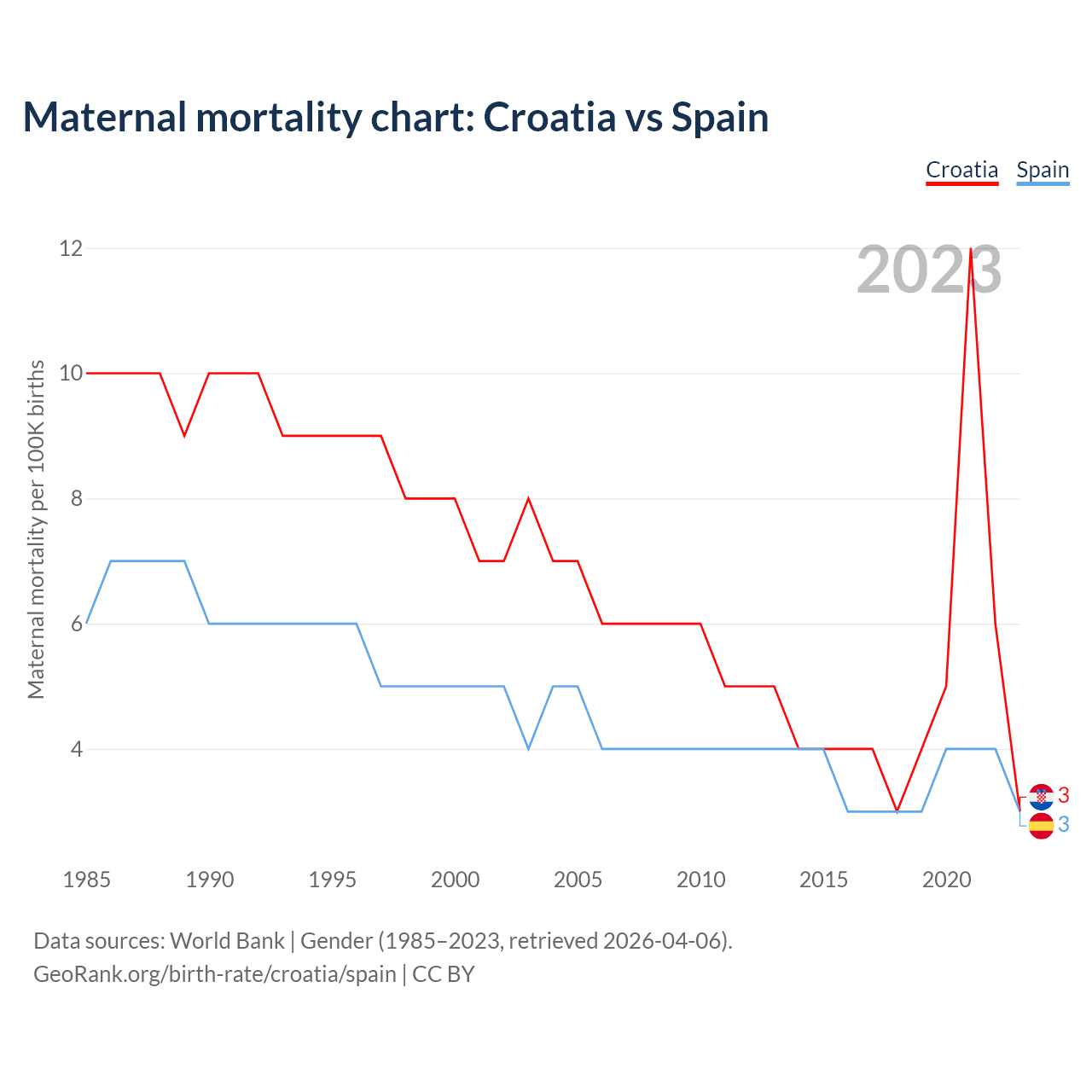 The maternal mortality rate, which is the probability of dying during childbirth or within 42 days of pregnancy termination, is 3 deaths per 100,000 live births in Croatia, compared to 3 deaths in Spain.