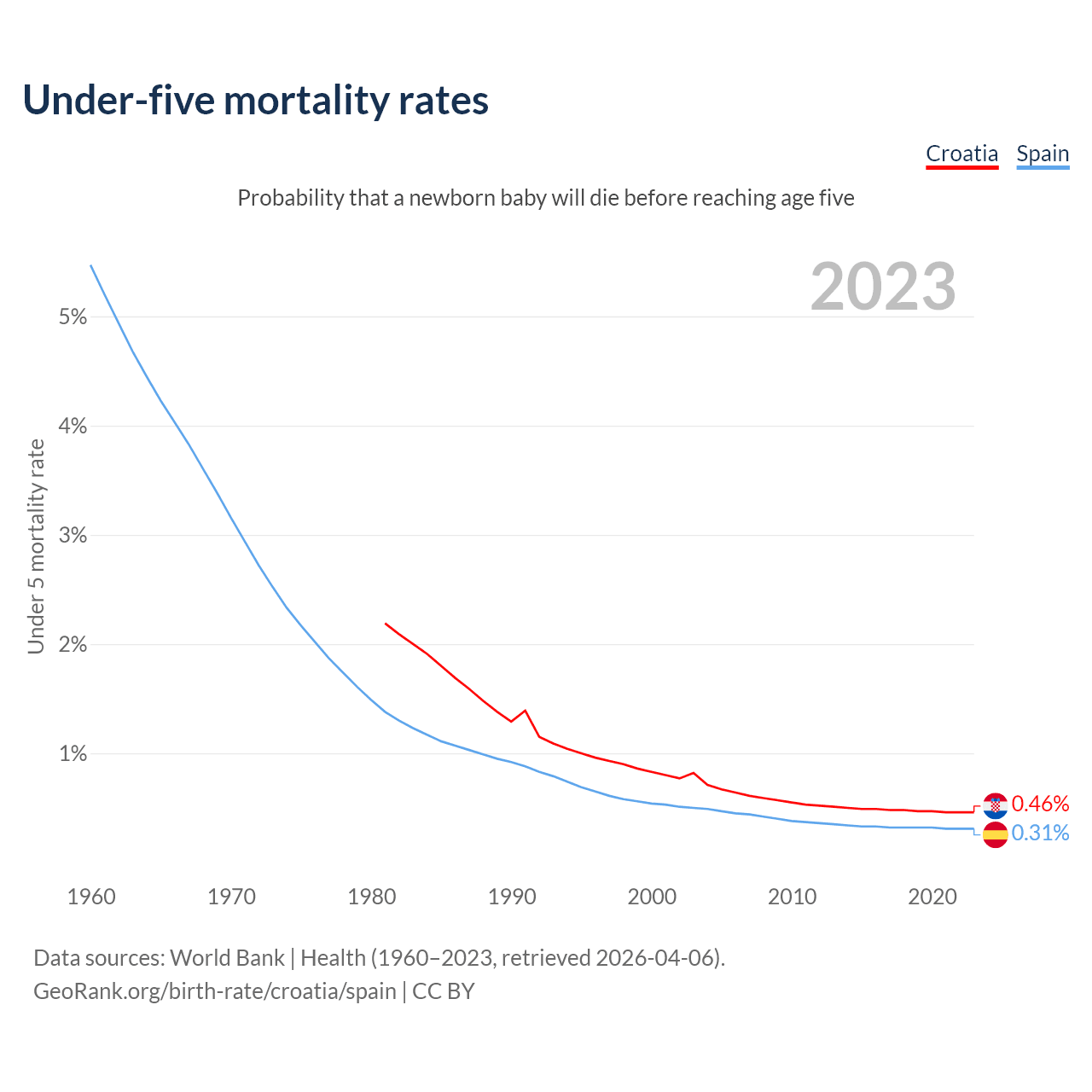 The chance that a newborn baby will die before reaching age five is 0.46% in Croatia and 0.31% in Spain. Above is a chart with historical data on under-five mortality rates.