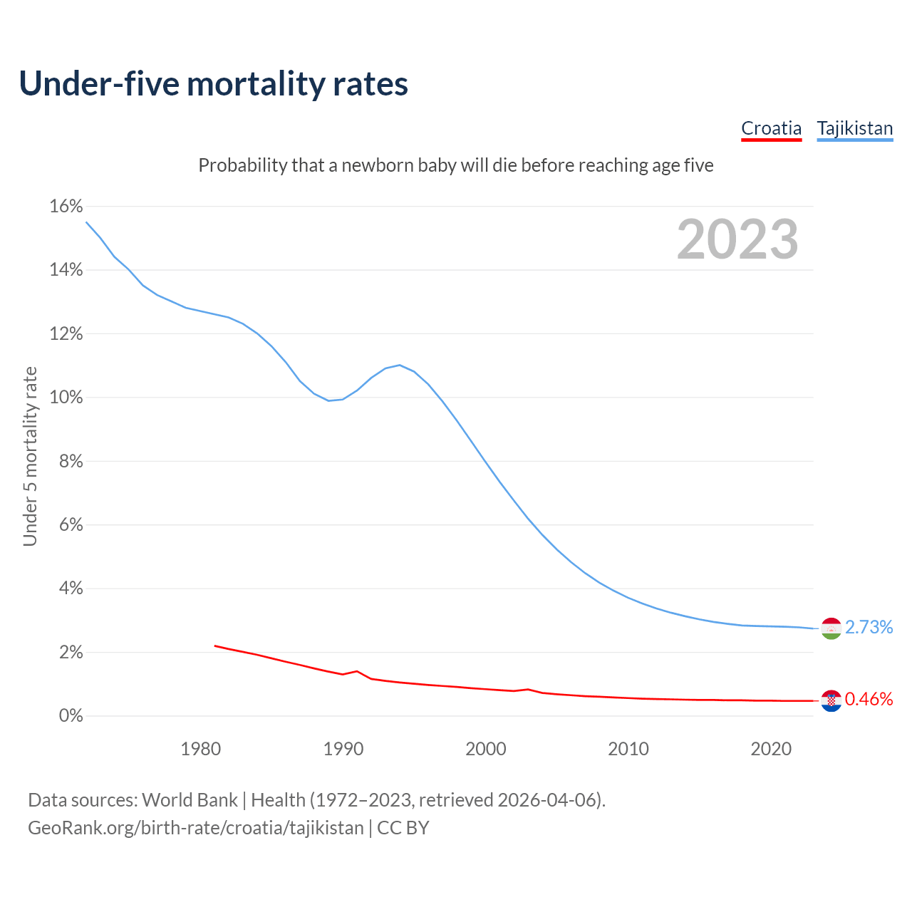 The chance that a newborn baby will die before reaching age five is 0.46% in Croatia and 2.73% in Tajikistan. Above is a chart with historical data on under-five mortality rates.