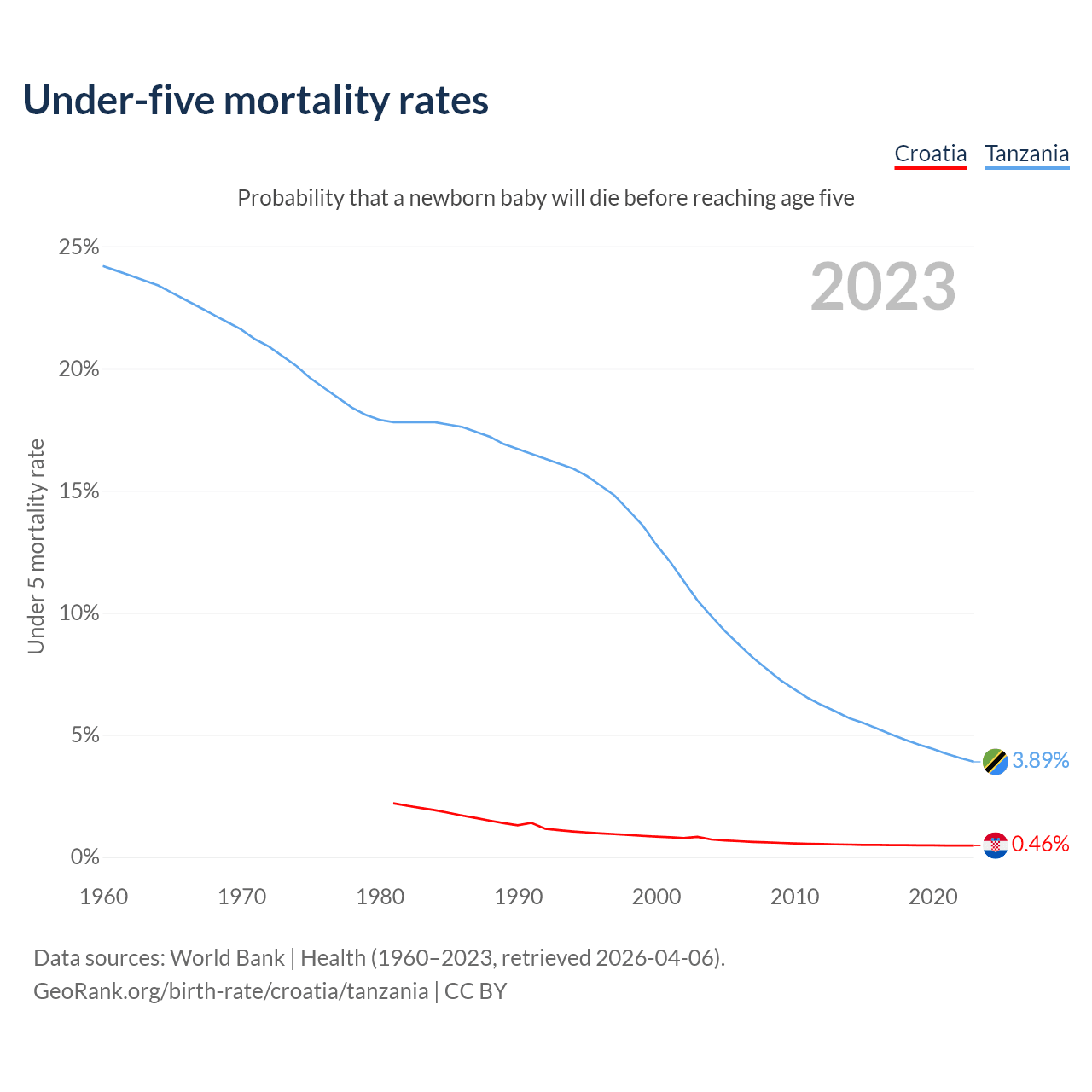 The chance that a newborn baby will die before reaching age five is 0.46% in Croatia and 3.89% in Tanzania. Above is a chart with historical data on under-five mortality rates.