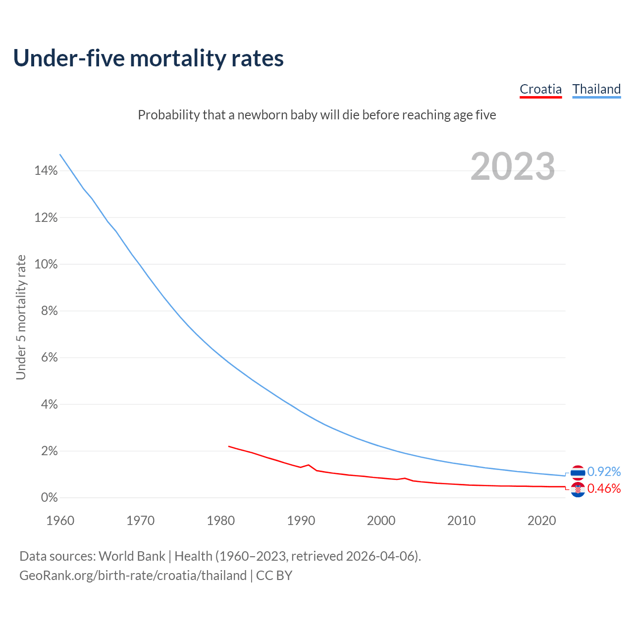 The chance that a newborn baby will die before reaching age five is 0.46% in Croatia and 0.92% in Thailand. Above is a chart with historical data on under-five mortality rates.