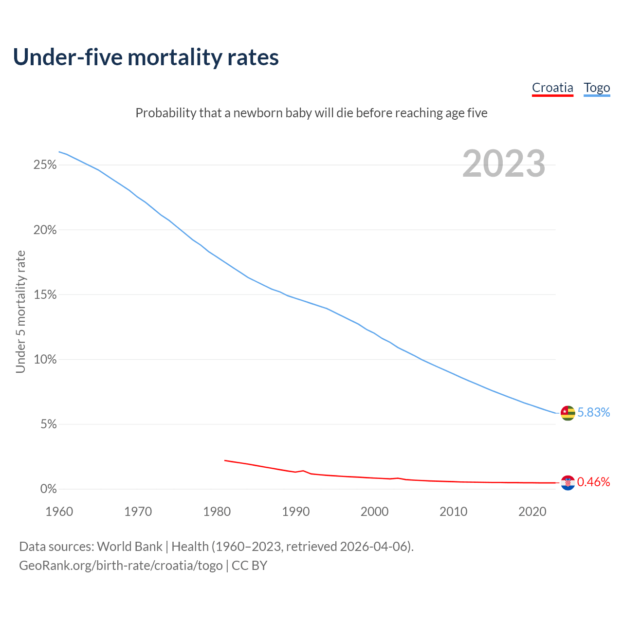 The chance that a newborn baby will die before reaching age five is 0.46% in Croatia and 5.83% in Togo. Above is a chart with historical data on under-five mortality rates.