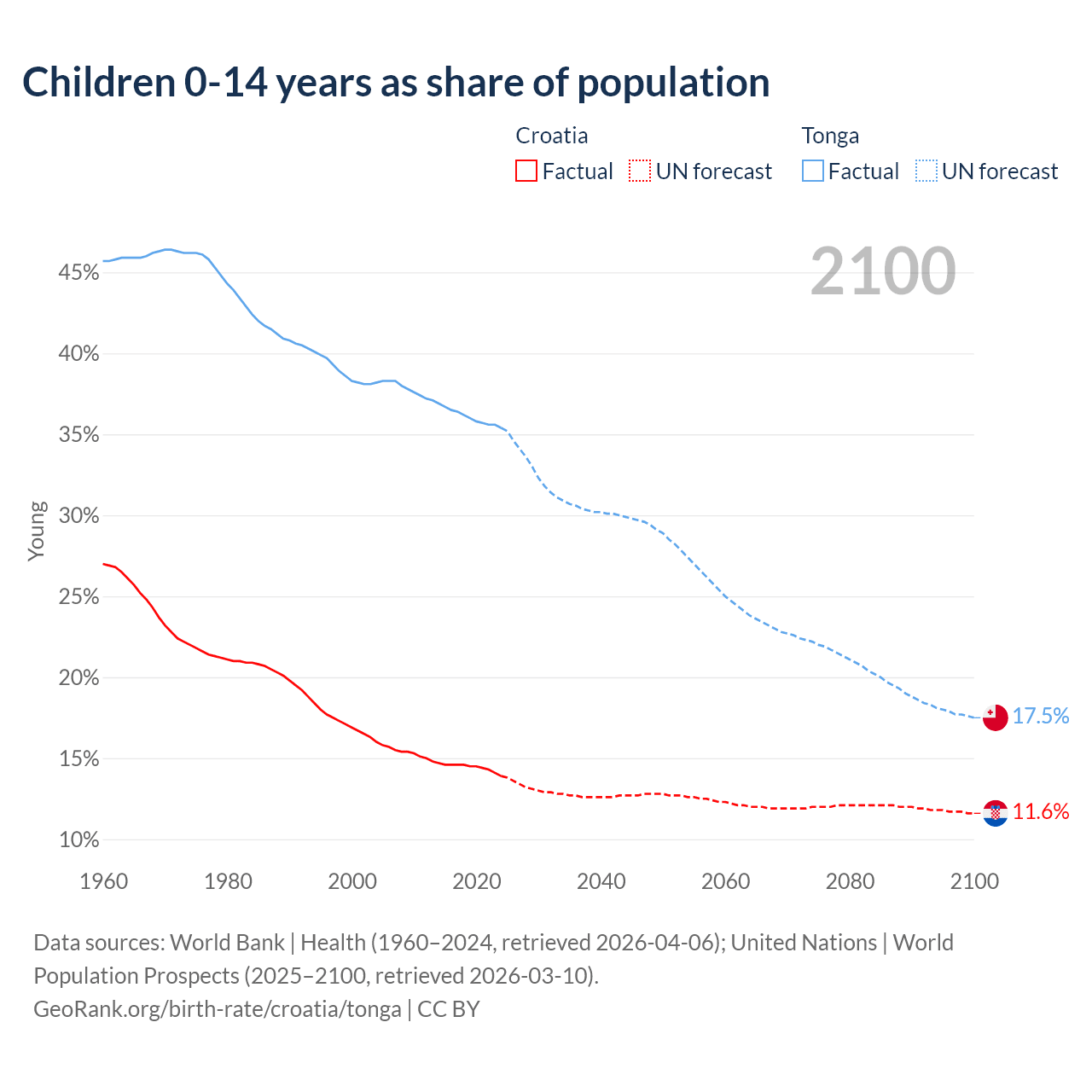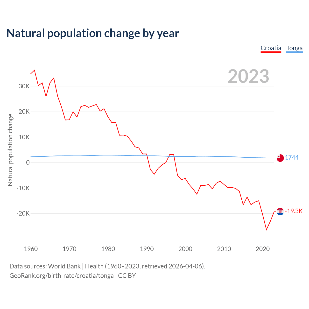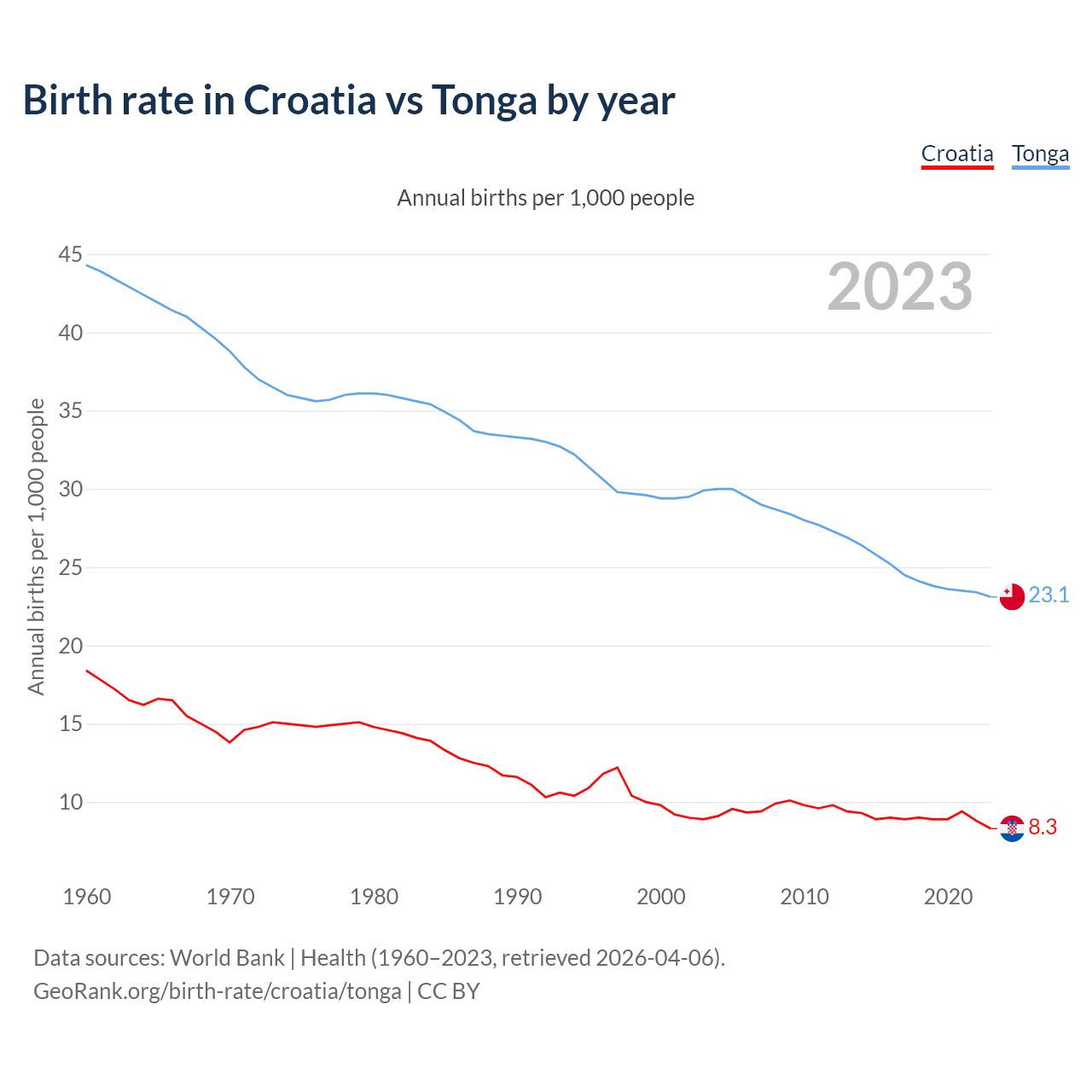 Croatia has an annual birth rate of 8.3 births per 1,000 people, compared to 23.1 for Tonga. The average number of children a woman is expected to have during her lifetime — the fertility rate, is 1.46 in Croatia and 3.13 in Tonga — 114.3% difference.
